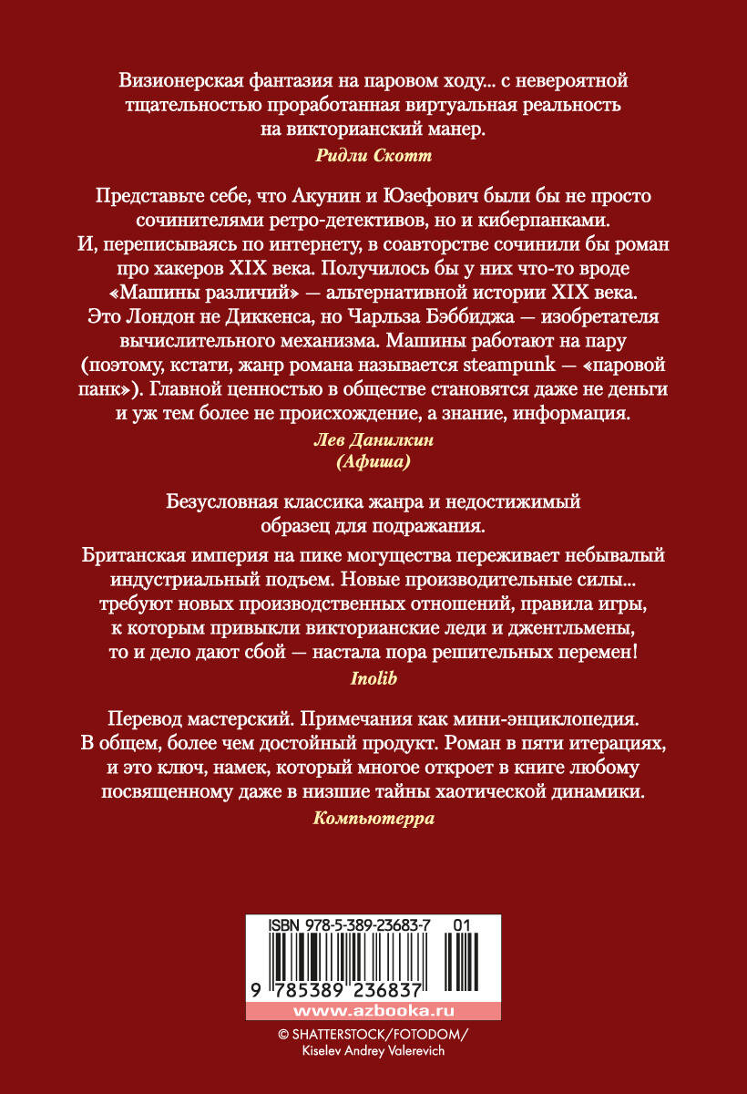 Шедевр альтернативной истории, краеугольный камень субкультуры стимпанка ("парового панка"), единственный пример полновесного сотворчества двух жанровых революционеров, которым тесны рамки любого жанра. "Машина различий" - это широкомасштабная, полифоничная панорама мира, в котором одновременно с промышленной революцией произошла революция информационная, так что компьютер явился на век раньше положенного. Мира, в котором Чарльз Бэббидж построил свою разностную машину, а власть у аристократии перехватили лорды-радикалы во главе с Байроном. Мира, в котором палеонтологи-катастрофисты ожесточенно спорят с униформистами, возглавляемая Карлом Марксом коммуна взяла власть в Нью-Йорке, вычислительные мощности измеряются суммарной длиной зацепления медных шестеренок, Лондону грозит экологическая катастрофа, а бунтовщики-луддиты предоставляют конспирологам богатую пищу для размышлений…| Издательство | Азбука-Аттикус Издат.группа ООО |