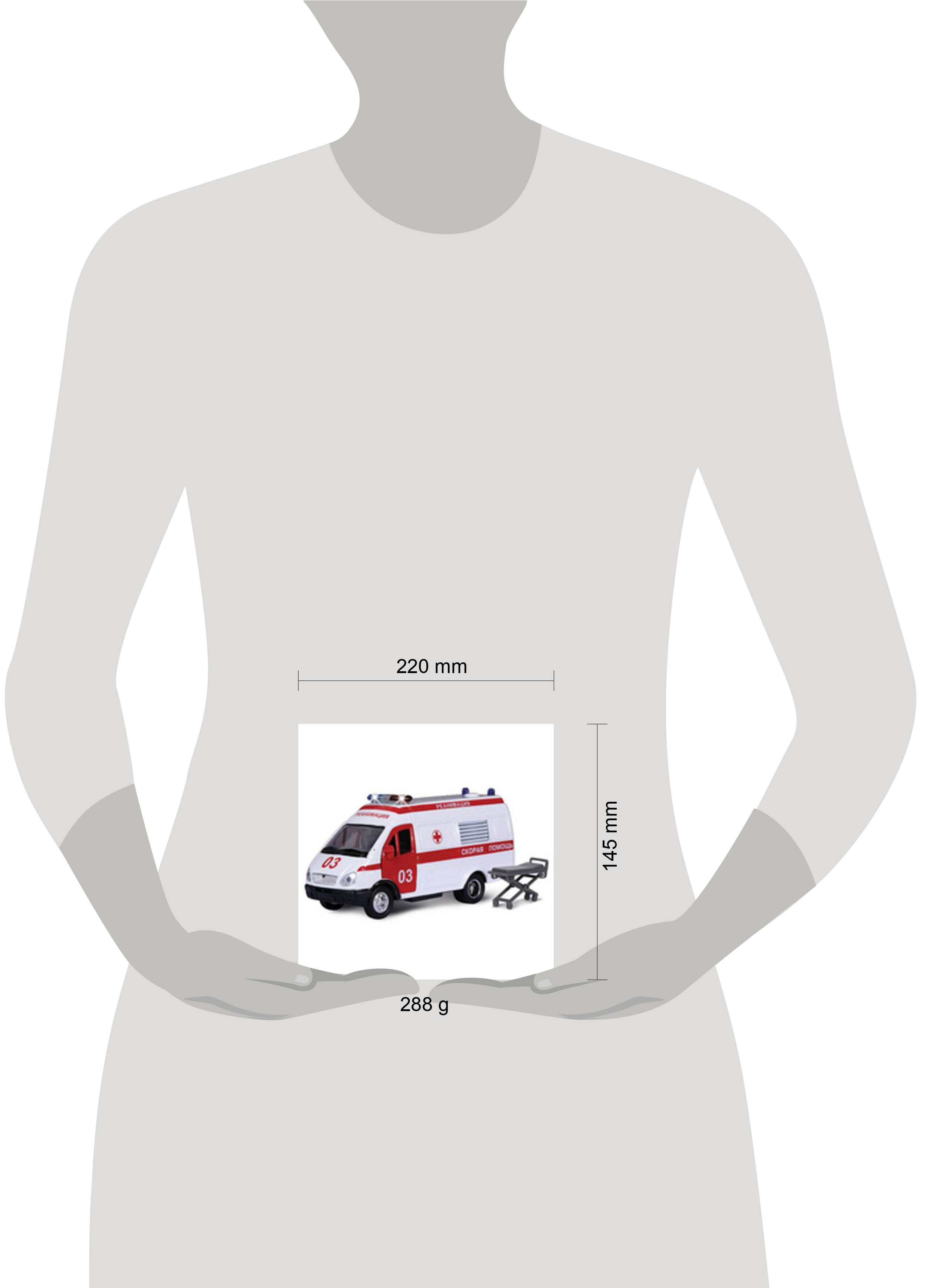 Машина оснащена блоком мигалки со звуком сирены, которая включается при нажатии на корпус. У машины открываются 2 передние двери. В кабине есть имитация приборной панели и макет рулевого колеса. Игрушка имеет механизм инерционного движения, который сопровождается урчанием. Также у машины распахиваются задние двери. Есть миниатюрные каталка-носилки. Машина работает от 3 батареек типа LR 41 (AG 3), входят в комплект. Масштаб: 1:43. Размер машины: длина 15 см, ширина 6 см, высота от колеса до мигалки 6,5 см. Размер больничного отсека: длина 8 см, ширина 4 см, высота 4 см. Возраст: с 3 лет.| Издательство | С-Маркет ООО |