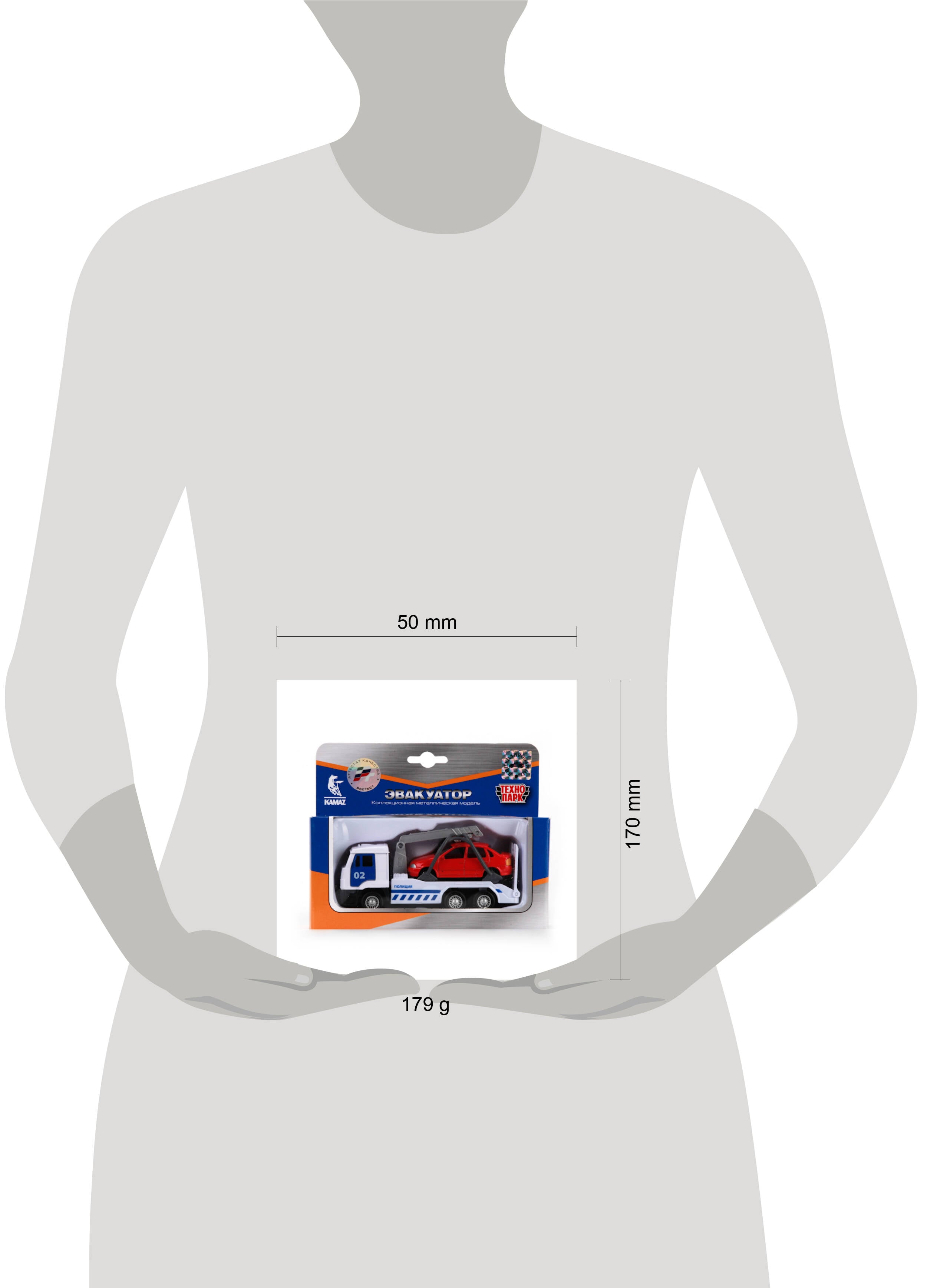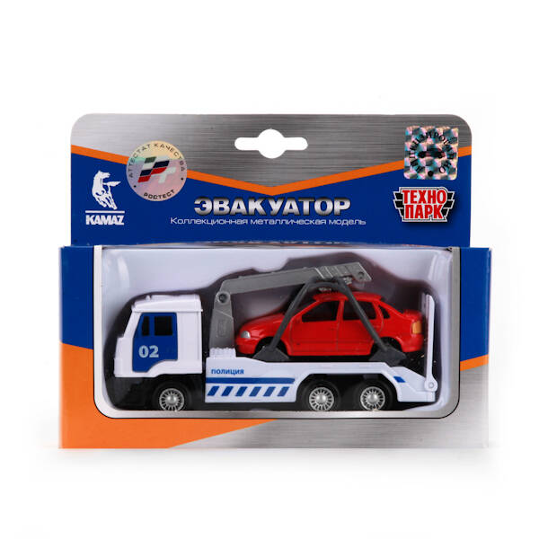 МАШИНА "ТЕХНОПАРК" МЕТАЛЛ. ИНЕРЦ. КАМАЗ. ЭВАКУАТОР ПОЛИЦИЯ 12СМ, С МАШИНКОЙ В РУСС. КОР в кор.2*36шт