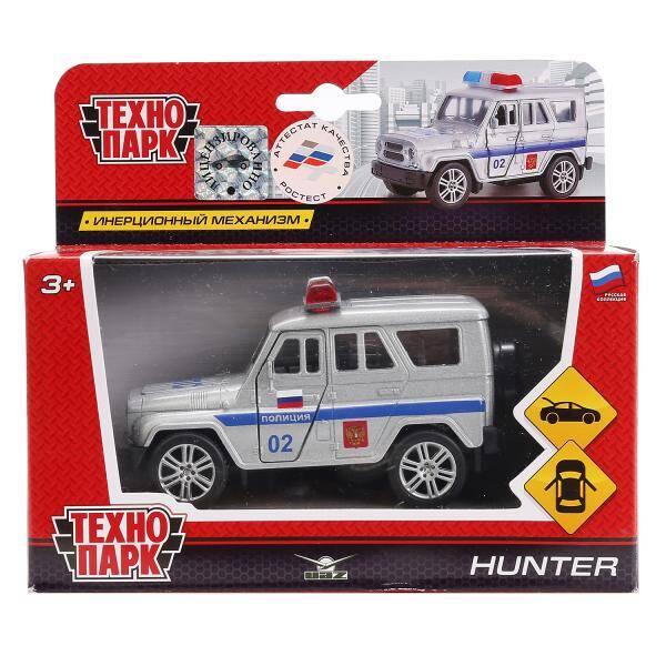 МАШИНА "ТЕХНОПАРК" МЕТАЛЛ. ИНЕРЦ. UAZ HUNTER ПОЛИЦИЯ 11,5СМ, ОТКРЫВ. ДВЕРИ В РУСС. КОР. в кор.2*24шт