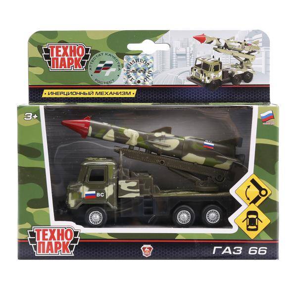 МАШИНА "ТЕХНОПАРК"МЕТАЛЛ. ИНЕРЦ. ГАЗ 66 С РАКЕТОЙ, 12СМ ЗЕЛ. КАМУФ.,ОТКРЫВ. ДВЕРИ В КОР в кор.2*24шт