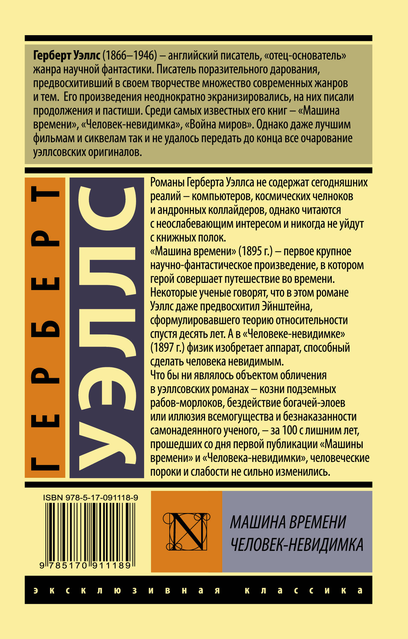 Герберт Уэллс (1866 - 1946) - английский писатель, "отец-основатель" жанра научной фантастики. Романы Герберта Уэллса не содержат сегодняшних реалий - компьютеров, космических челноков и андронных коллайдеров, однако читаются с неослабевающим интересом и никогда не уйдут с книжных полок. Что бы ни являлось объектом обличения в уэллсовских романах - козни подземных рабов-морлоков, бездействие богачей-элоев или иллюзия всемогущества и безнаказанности самонадеянного ученого, - за 100 с лишним лет, прошедших со дня первой публикации "Машины времени" и "Человека-невидимки", человеческие пороки и слабости не сильно изменились.| Издательство | ИЗДАТЕЛЬСТВО "АСТ" |