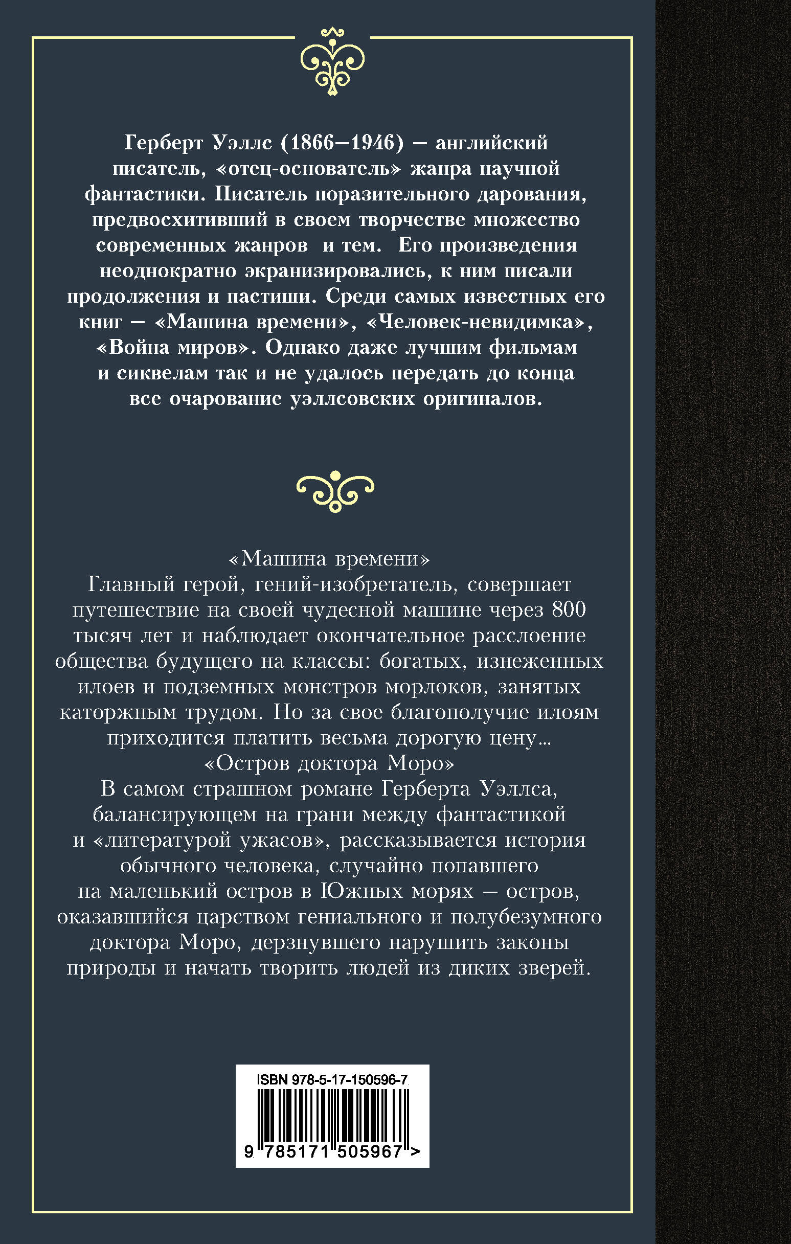 "Машина времени" Главный герой, гений-изобретатель, совершает путешествие на своей чудесной машине через 800 тысяч лет и наблюдает окончательное расслоение общества будущего на классы: богатых, изнеженных илоев и подземных монстров морлоков, занятых каторжным трудом. Но за свое благополучие илоям приходится платить весьма дорогую цену… "Остров доктора Моро" В самом страшном романе Герберта Уэллса, балансирующем на грани между фантастикой и "литературой ужасов", рассказывается история обычного человека, случайно попавшего на маленький остров в Южных морях - остров, оказавшийся царством гениального и полубезумного доктора Моро, дерзнувшего нарушить законы природы и начать творить людей из диких зверей.| Издательство | АСТ |
