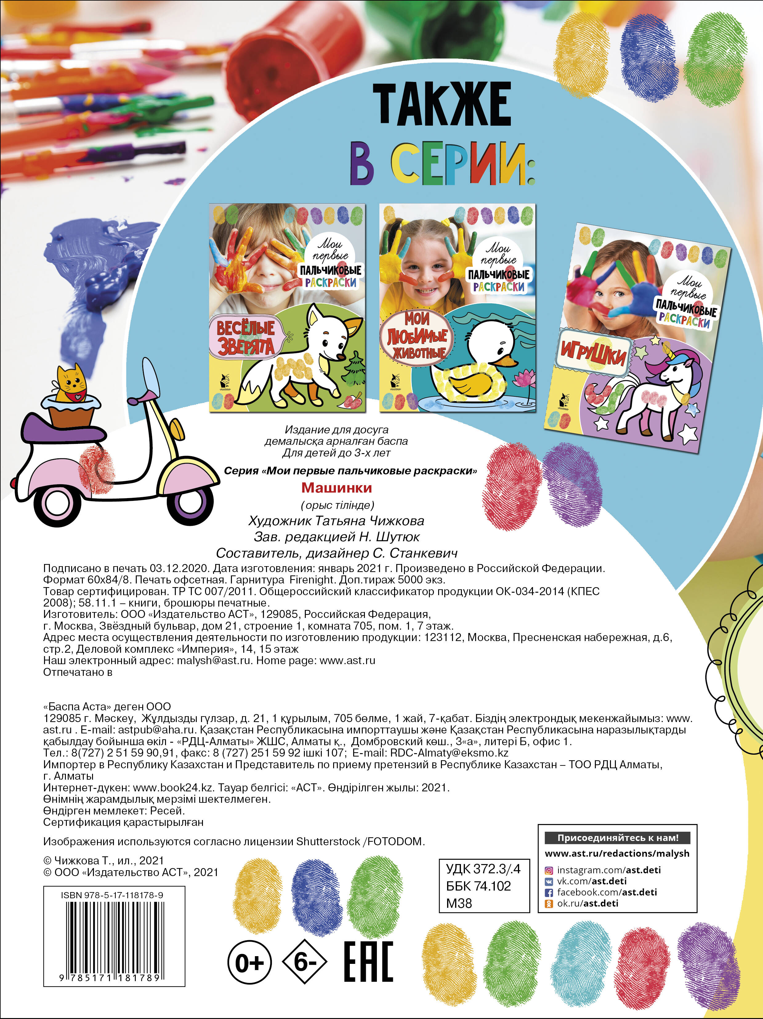 Раскраски для пальчиков - первый шаг к знакомству малыша с раскрасками. Они не только развивают мелкую моторику, координацию движений и способствуют концентрации внимания ребенка, но и подготовят его ручки к рисованию карандашами и кисточками. А благодаря легким заданиям малыш сможет сам создавать яркие и забавные иллюстрации!| Издательство | ИЗДАТЕЛЬСТВО "АСТ" |