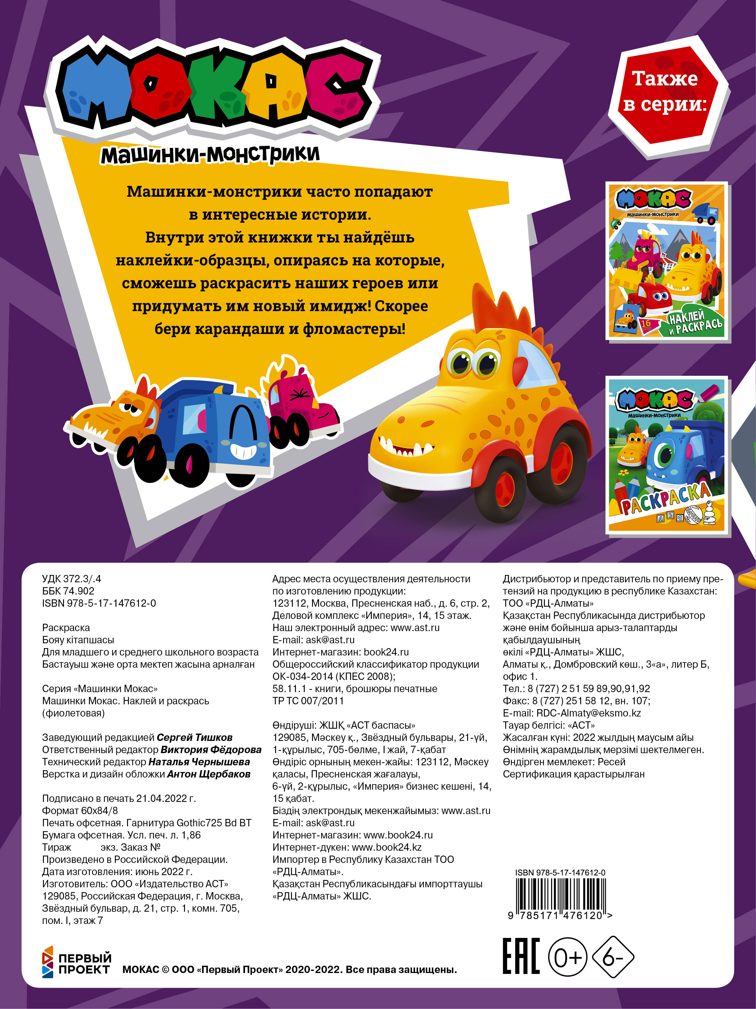 Аннотация: Машинки Мокас. Наклей и раскрась (фиолетовая)