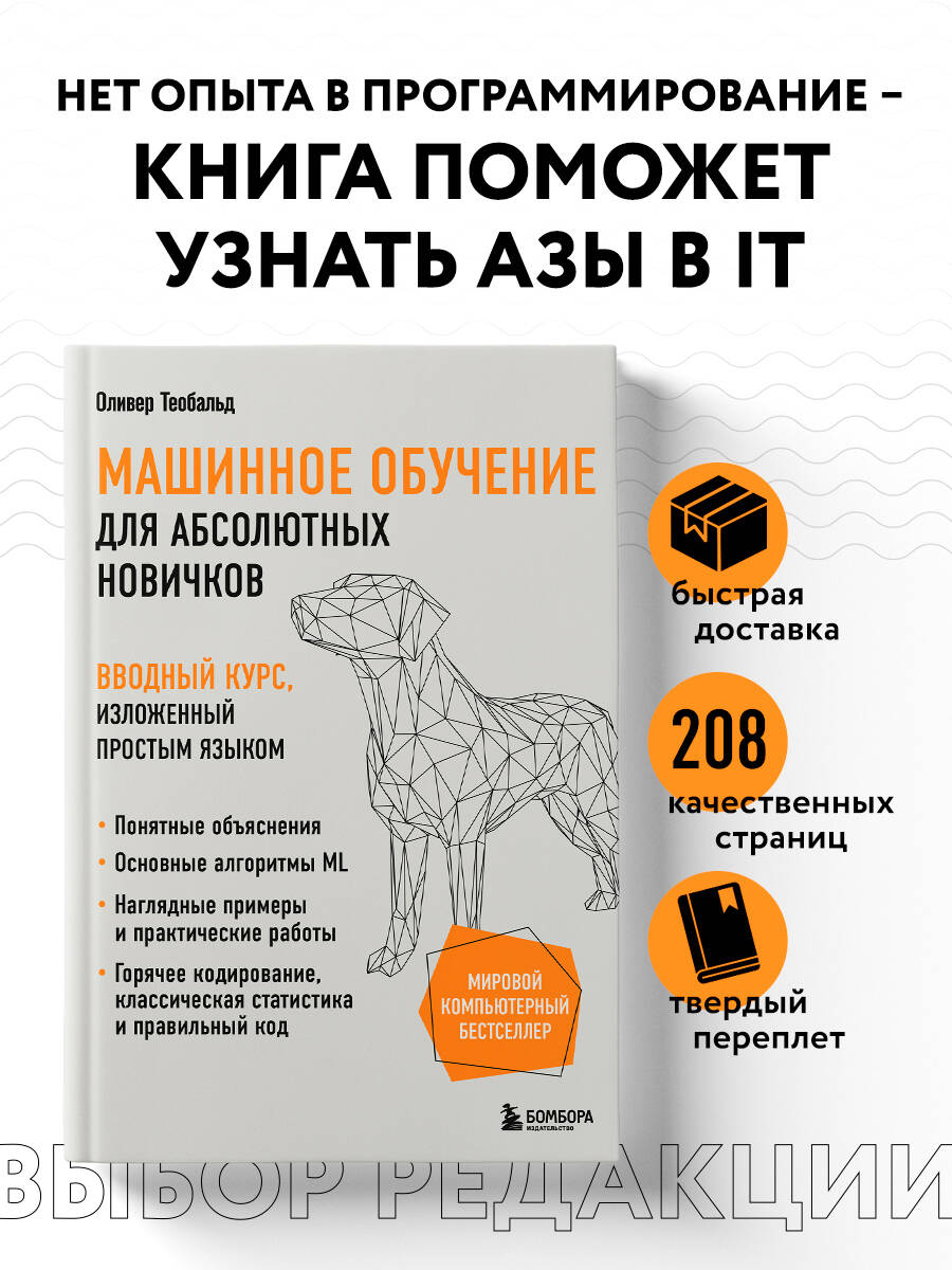 Практическое и подробное введение в машинное обучение. Простые и понятные объяснения и отсутствие необходимости опыта программирования делают эту книгу прекрасной альтернативой академическому учебнику. Здесь представлены основные алгоритмы машинного обучения (ML), которые сопровождаются наглядными примерами и практическими работами. Также вы узнаете про перекрестную проверку, ансамблевое моделирование, поиск по сетке для настройки моделей, проектирование функций, горячее кодирование и многое другое. Для разработки интеллектуальных машин в первую очередь надо понять классическую статистику, так как алгоритмы на ее основе - это сердце машинного обучения. Написание кода - еще одна неотъемлемая часть ML, которая предусматривает управление данными. Однако материал этого руководства можно освоить даже без навыков программирования. Возможно, с чтения этой книги начнется ваш путь к получению работы в области машинного обучения, а может быть, она просто удовлетворит ваше любопытство. Внутри руководства: • Загрузка бесплатных наборов данных. • Методы очистки данных, включая горячее кодирование, группирование и обработку недостающих данных. • Подготовка данных для анализа. • Линейный регрессионный анализ. • Кластеризация, включая кластеризацию k-средних. • Основы работы нейронных сетей. • Смещение/дисперсия для улучшения модели машинного обучения. • Деревья решений для декодирования классификации. • Ваша первая модель машинного обучения с помощью Python. Об авторе ОЛИВЕР ТЕОБАЛЬД - технический писатель, специализирующийся на темах искусственного интеллекта, финансовых технологий и облачных вычислений. Автор книг Python for Absolute Beginners, Machine Learning with Python for Beginners, Data Analytics for Absolute Beginners и др.| Издательство | ООО "Издательство "Эксмо" |