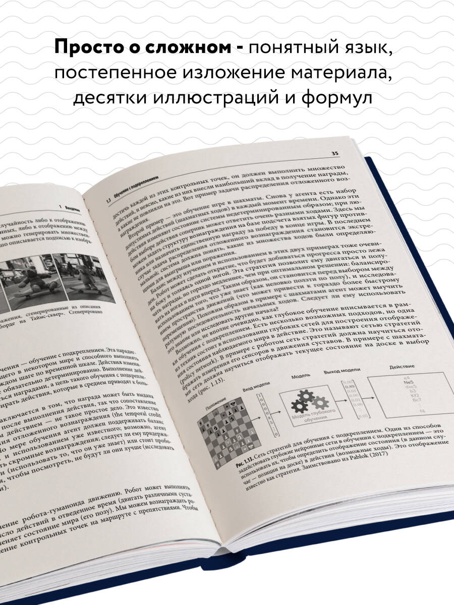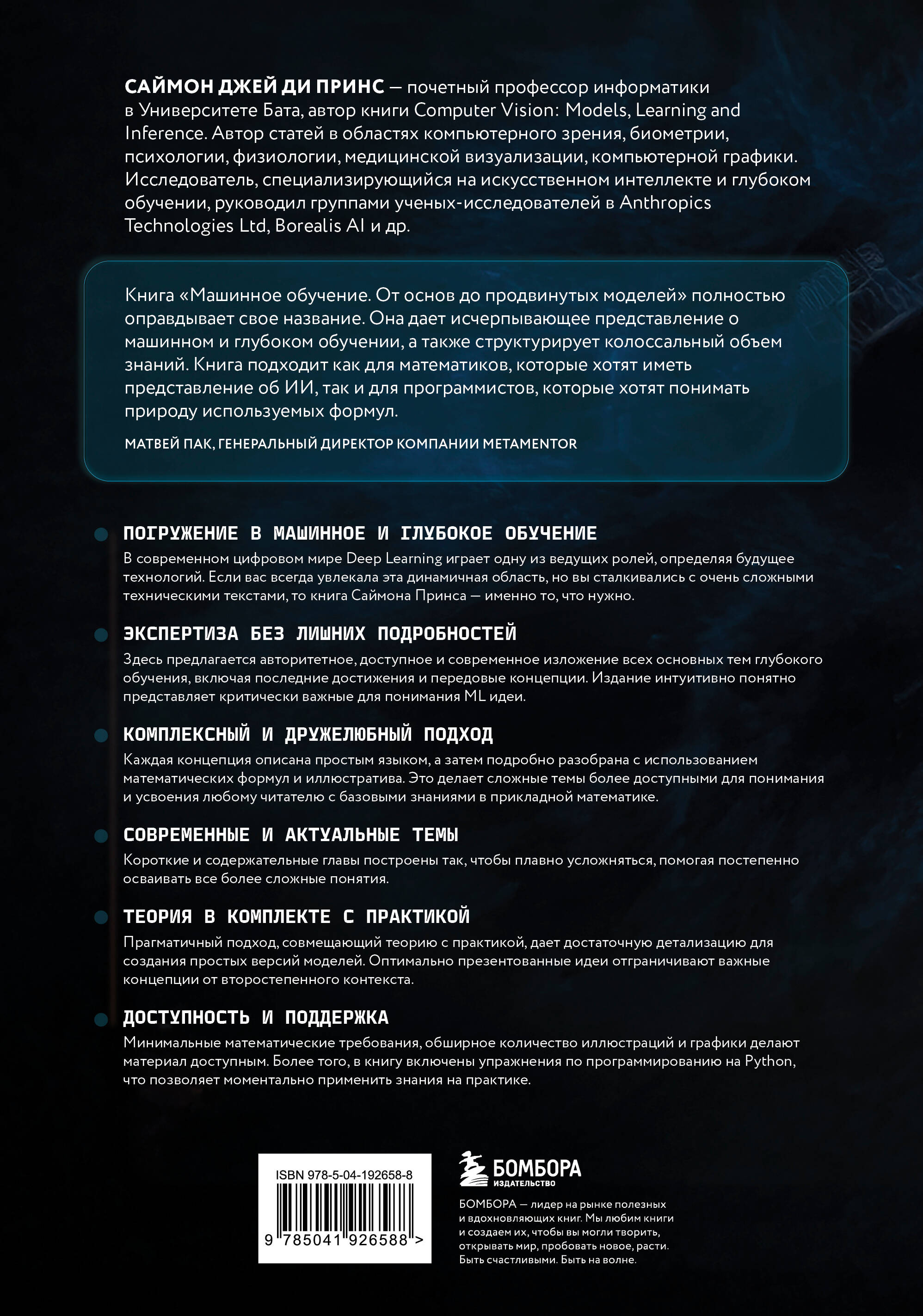 Погружение в машинное и глубокое обучение В современном цифровом мире Deep Learning играет одну из ведущих ролей, определяя будущее технологий. Если вас всегда увлекала эта динамичная область, но вы сталкивались с очень сложными техническими текстами, то книга Саймона Принса - именно то, что нужно. Экспертиза без лишних подробностей Здесь предлагается авторитетное, доступное и современное изложение всех основных тем глубокого обучения, включая последние достижения и передовые концепции. Издание интуитивно понятно представляет критически важные для понимания ML идеи. Комплексный и дружелюбный подход Каждая концепция описана простым языком, а затем подробно разобрана с использованием математических формул и иллюстратива. Это делает сложные темы более доступными для понимания и усвоения любому читателю с базовыми знаниями в прикладной математике. Современные и актуальные темы Короткие и содержательные главы построены так, чтобы плавно усложняться, помогая постепенно осваивать все более сложные понятия. Теория в комплекте с практикой Прагматичный подход, совмещающий теорию с практикой, дает достаточную детализацию для создания простых версий моделей. Оптимально презентованные идеи отграничивают важные концепции от второстепенного контекста. Доступность и поддержка Минимальные математические требования, обширное количество иллюстраций и графики делают материал доступным. Более того, в книгу включены упражнения по программированию на Python, что позволяет моментально применить знания на практике. Об авторе Саймон Джей Ди ПРИНС - почетный профессор информатики в Университете Бата, автор книги Computer Vision: Models, Learning and Inference. Автор статей в областях компьютерного зрения, биометрии, психологии, физиологии, медицинской визуализации, компьютерной графики. Исследователь, специализирующийся на искусственном интеллекте и глубоком обучении, руководил группами ученых-исследователей в Anthropics Technologies Ltd, Borealis AI и др. «Книга "Машинное обучение. От основ до продвинутых моделей" полностью оправдывает свое название. Она дает исчерпывающее представление о машинном и глубоком обучении, а также структурирует колоссальный объем знаний. Книга подходит как для математиков, которые хотят иметь представление об ИИ, так и для программистов, которые хотят понимать природу используемых формул». - Матвей Пак, генеральный директор компании METAMENTOR| Издательство | ООО "Издательство "Эксмо" |