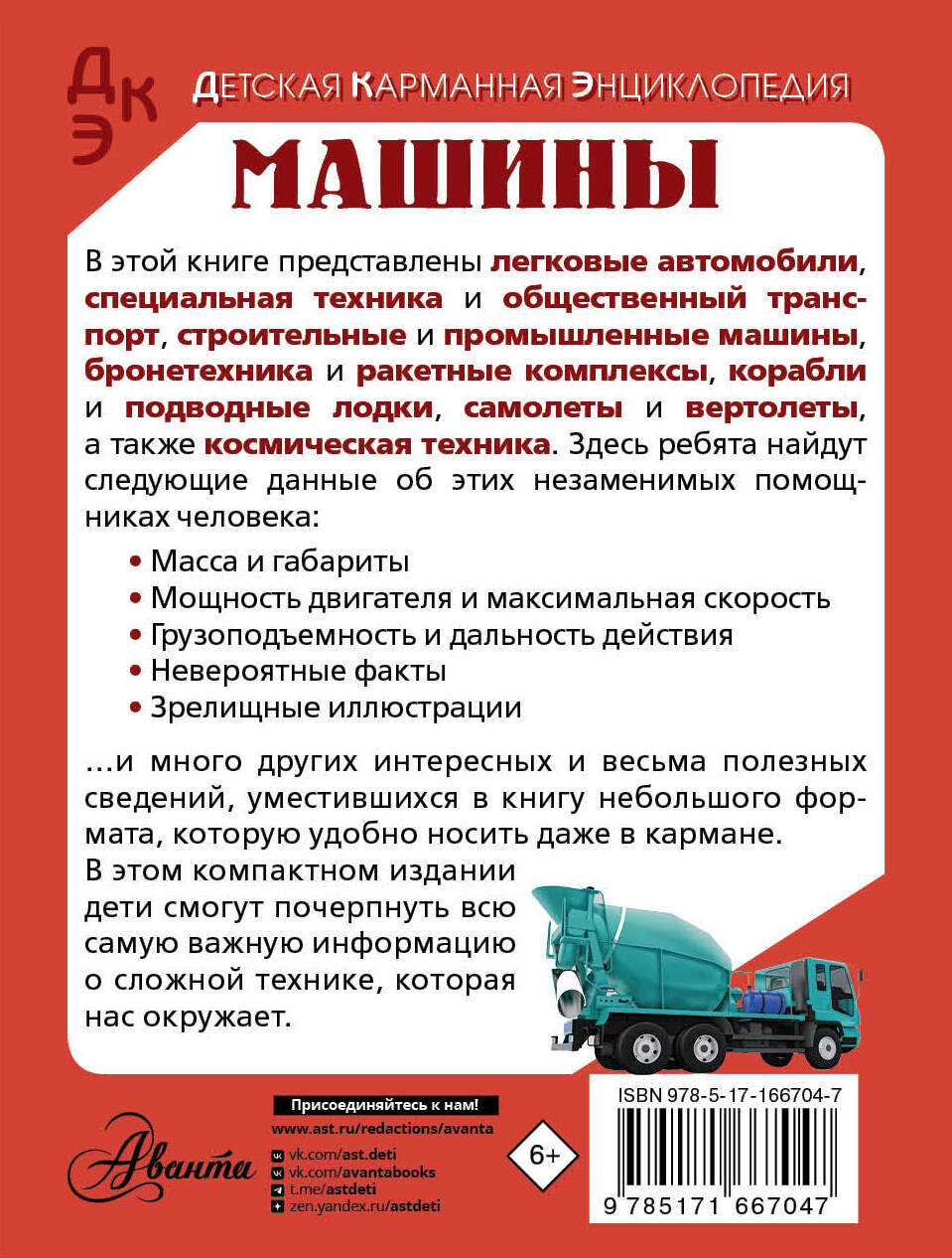 На страницах этой книги юные читатели найдут справочную информацию о машинах, работающих не только на нашей планете - на земле, воде и ввоздухе,- но и в далеком космическом пространстве. А самое главное - здесь содержатся интересные и порой поражающие воображение факты о специальной технике и общественном транспорте, легковых автомобилях, строительных машинах, бронетехнике и ракетных комплексах, кораблях и подводных лодках, самолетах ивертолетах, а также о космической технике. Множество высокотехнологичных машин, их основные отличительные черты, масса и габариты, мощность двигателя и максимальная скорость, уникальные особенности, а также познавательные сведения о достижениях человечества внаучно-технической сфере и в области машиностроения - в одном издании компактного формата. Каждый образец техники представлен на красочных иллюстрациях, чтосделает знакомство с миром машин еще более увлекательным! Для среднего и старшего школьного возраста.| Издательство | Издательство "АСТ" |