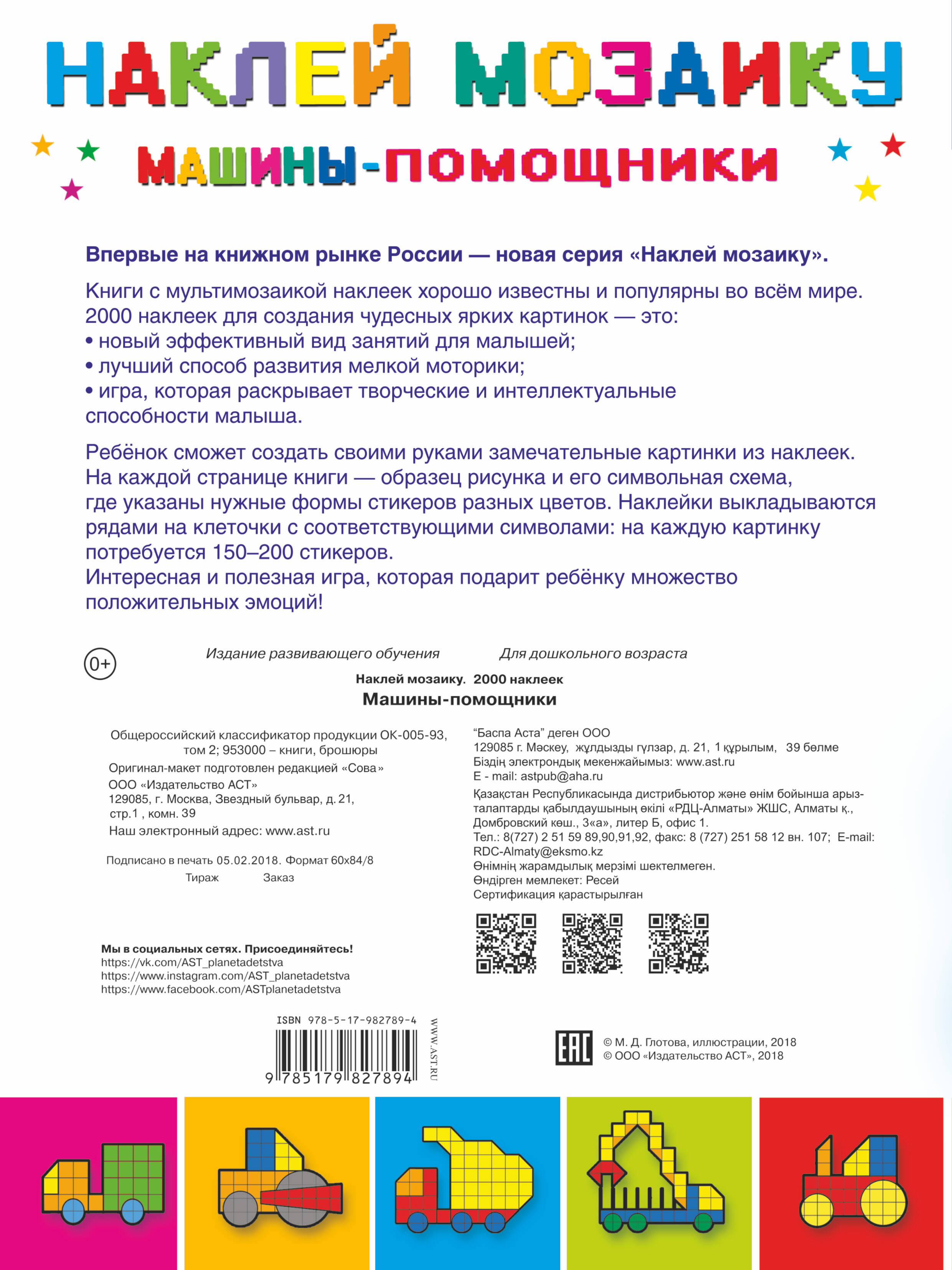 Книги с мультимозаикой наклеек хорошо известны и популярны во всем мире. 2000 наклеек для создания чудесных ярких картинок - это: - новый эффективный вид занятий для малышей; - лучший способ развития мелкой моторики; - игра, которая раскрывает творческие и интеллектуальные способности малыша. Ребёнок сможет создать своими руками замечательные картинки разнообразных машин из наклеек. На каждой странице книги - образец рисунка и его символьная схема, где указаны нужные формы стикеров разных цветов. Наклейки выкладываются рядами на клеточки с соответствующими символами: на каждую картинку потребуется 150 - 200 стикеров. Интересная и полезная игра, которая подарит ребенку множество положительных эмоций!| Издательство | Издательство "АСТ" |