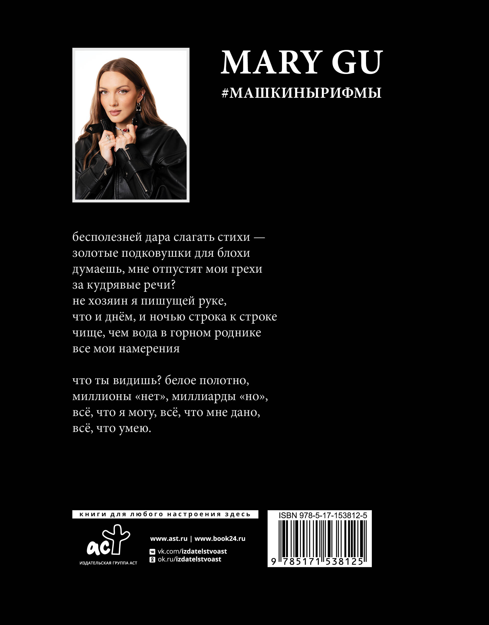 ✨ Mary Gu - одна из самых ярких певиц нового поколения: миллионы прослушиваний треков, sold out на концертах и сотни тысяч подписчиков в соцсетях. Теперь её тексты собраны в дебютном сборнике стихов «#Машкинырифмы». - Более 40 стихотворений, написанных с 2015 года. - Более 1,5 млн просмотров и дочитываний в сети в рубрике #машкинырифмы. - 128 страниц откровенной лирики и визуальной эстетики: авторские иллюстрации, личные мысли исполнительницы и особая атмосфера. Это книга о любви, поиске себя, о боли и надежде - честная и настоящая, как разговор с подругой. «#Машкинырифмы» - книга, которая станет украшением вашей полки и хорошим подарком.| Издательство | Издательство "АСТ" |