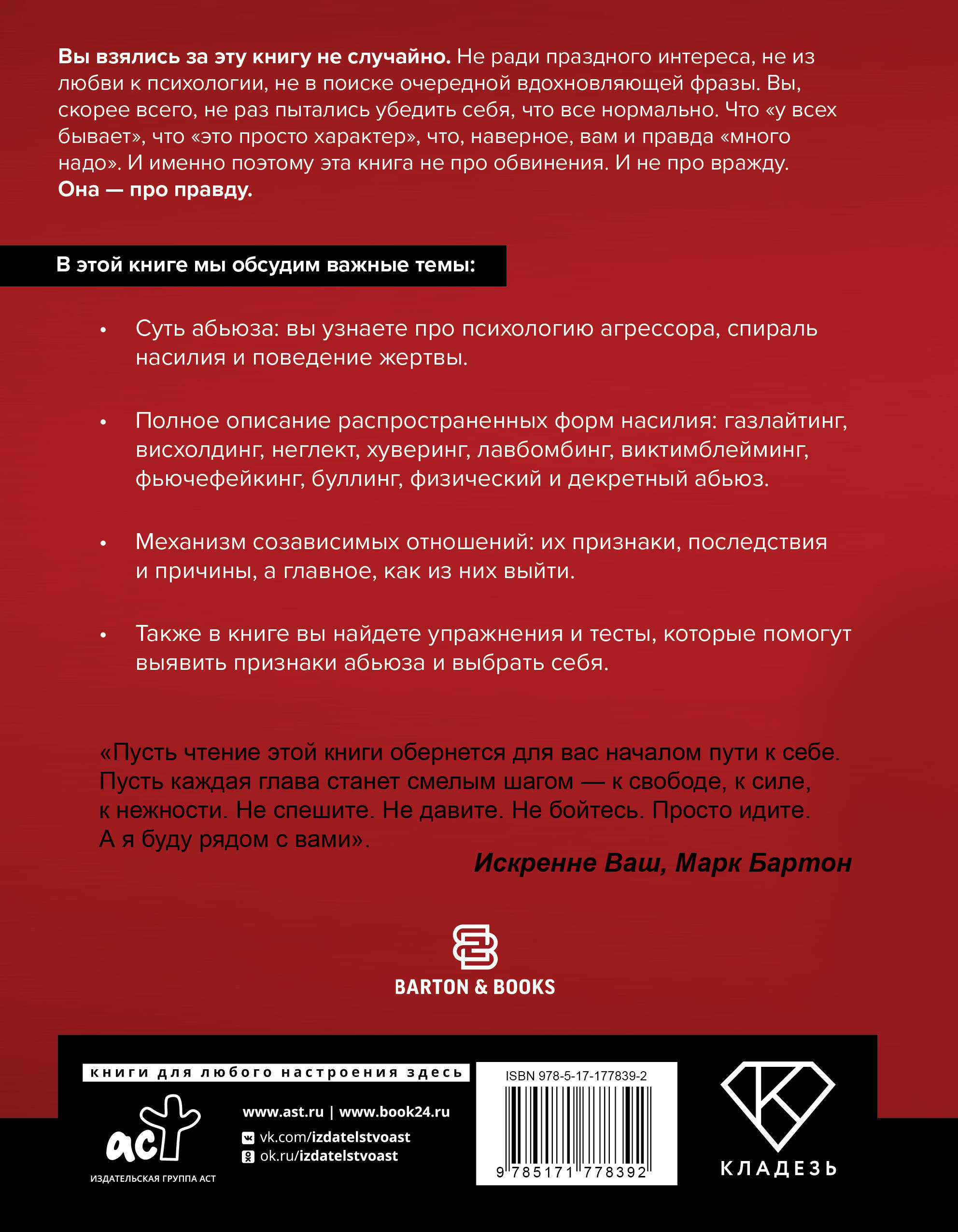 Вы взялись за эту книгу не случайно. Не ради праздного интереса, не из любви к психологии, не в поиске очередной вдохновляющей фразы. Вы, скорее всего, не раз пытались убедить себя, что все нормально. Что "у всех бывает", что "это просто характер", что, наверное, вам и правда "много надо". И именно поэтому эта книга не про обвинения. И не про вражду. Она - про правду. В этой книге мы обсудим важные темы: • Суть абьюза: вы узнаете про психологию агрессора, спираль насилия и поведение жертвы. • Полное описание распространенных форм насилия: газлайтинг, висхолдинг, неглект, хуверинг, лавбомбинг, виктимблейминг, фьючефейкинг, буллинг, физический и декретный абьюз. • Механизм созависимых отношений: их признаки, последствия и причины, а главное, как из них выйти. Также в книге вы найдете упражнения и тесты, которые помогут выявить признаки абьюза и выбрать себя. "Пусть чтение этой книги обернется для вас настоящим погружением в саму себя. Пусть каждая глава станет смелым шагом - к свободе, к силе, к нежности. Не спешите. Не давите. Не бойтесь. Просто идите. А я буду рядом с вами". Искренне Ваш, Марк Бартон| Издательство | Издательство "АСТ" |