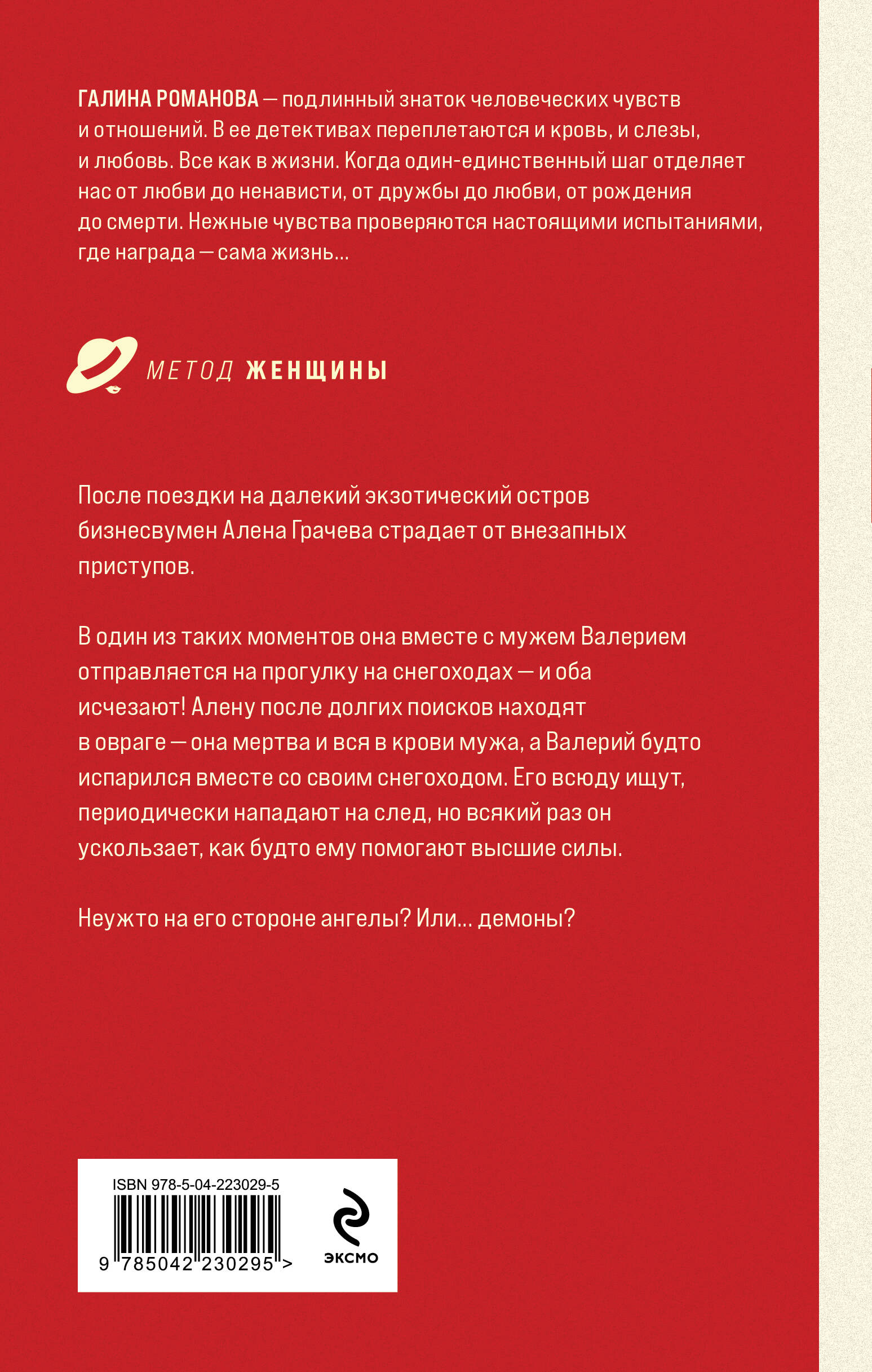 После поездки на далекий экзотический остров бизнесвумен Алена Грачева страдает от внезапных приступов. В один из таких моментов она вместе с мужем Валерием отправляется на прогулку на снегоходах - и оба исчезают! Алену после долгих поисков находят в овраге - она мертва и вся в крови мужа, а Валерий будто испарился вместе со своим снегоходом. Его всюду ищут, периодически нападают на след, но всякий раз он ускользает, как будто ему помогают высшие силы. Неужто на его стороне ангелы? Или... демоны? Галина Романова - подлинный знаток человеческих чувств и отношений. В ее детективных мелодрамах из серии «Метод женщины» переплетаются и кровь, и слезы, и любовь. Все, как в реальности, когда один-единственный шаг отделяет нас от любви до ненависти, от дружбы до любви, от рождения до смерти. Нежные чувства проверяются настоящими испытаниями, где награда - сама жизнь.| Издательство | ООО "Издательство "Эксмо" |