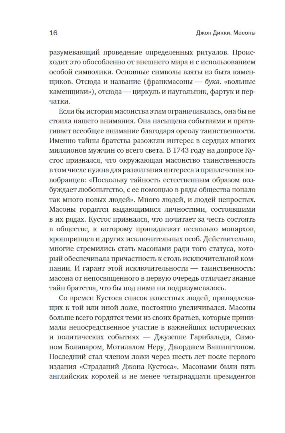 Что общего у Моцарта, Уинстона Черчилля, Артура Конан Дойля и Уолта Диснея? Все они были масонами. Возникшее в XVIII веке, братство на протяжении истории объединяло политиков, военных, спортсменов, актеров и писателей с нескольких континентов. Сегодня в Великобритании насчитывается 400 000 масонов, в США их более миллиона, а по всему миру - около шести миллионов. Масонов считали оппозиционерами, диверсантами и шпионами, по сей день вокруг движения существует множество теорий заговоров. Как проходили загадочные собрания лож? Что означает символика масонов? Какое положение в учении масонов занимают женщины? В ХХI веке масонство насчитывает несколько миллионов человек по всему миру и не теряет своего влияния. Британский историк Джон Дикки приоткрывает завесу тайны, которая окутывает масонское братство. «Некоторые из мифов о масонах вполне безвредны: они похожи на те страшилки, которые с приятным трепетом рассказывают друг другу подростки и в которые на самом деле никто не верит. Некоторые же из них весьма опасны. Страх масонского заговора стал причиной насильственной смерти тысячи членов лож в XX веке. Масонство до сих пор запрещено в Китайской Народной Республике, а в исламском мире к масонству уже давно относятся с параноидальной мнительностью. <...> Мифы и заблуждения вплелись в саму ткань истории масонства и уже от нее неотделимы» (Джон Дикки).| Издательство | КоЛибри |