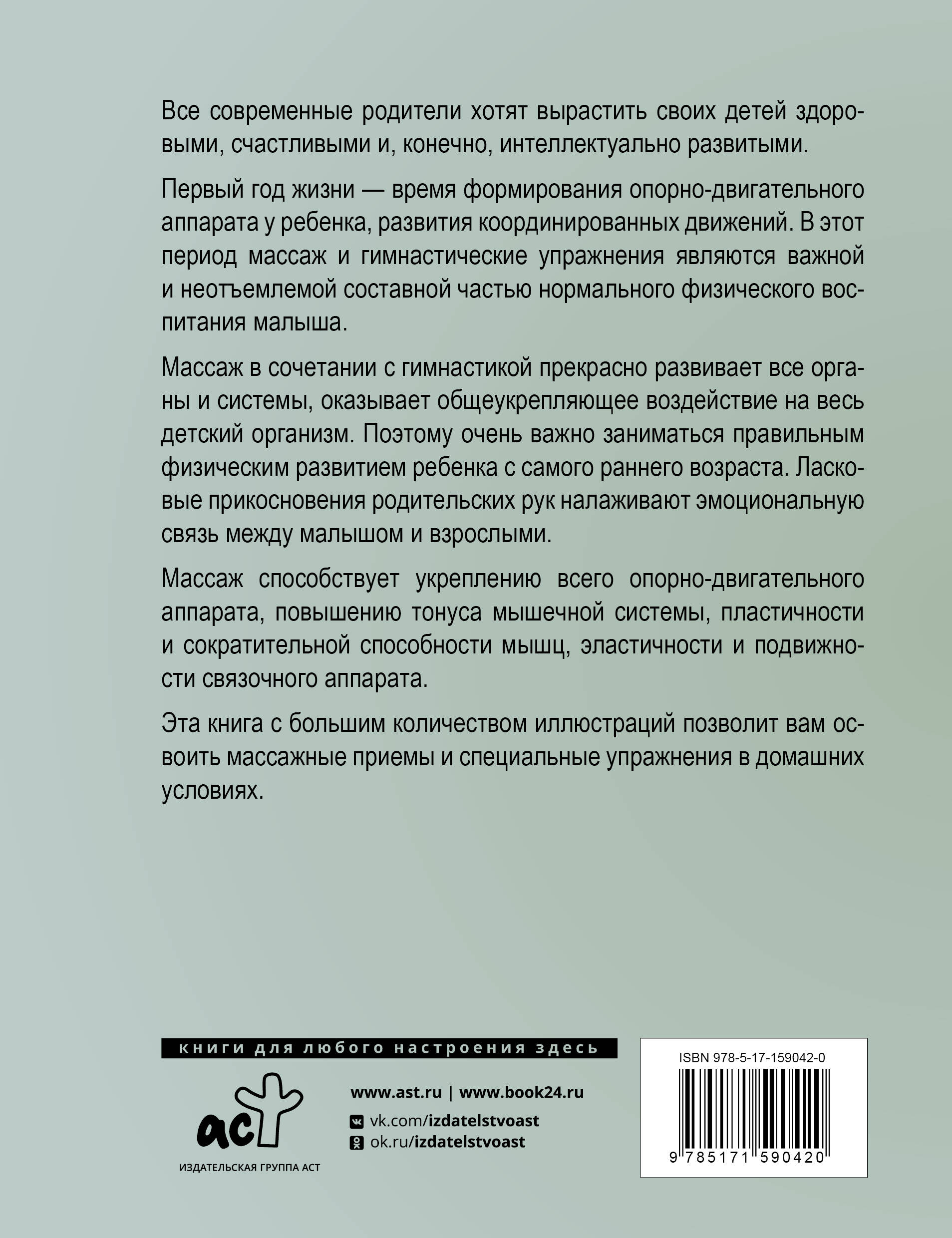 Все современные родители хотят вырастить своих детей здоровыми, счастливыми и, конечно, интеллектуально развитыми. Первый год жизни - время формирования опорно-двигательного аппарата у ребенка, развития координированных движений. В этот период массаж и гимнастические упражнения являются важной и неотъемлемой составной частью нормального физического воспитания малыша. Массаж в сочетании с гимнастикой прекрасно развивает все органы и системы, оказывает общеукрепляющее воздействие на весь детский организм. Поэтому очень важно заниматься правильным физическим развитием своего ребенка с самого раннего возраста. Эта книга с большим количеством иллюстраций позволит вам освоить приемы массажа и гимнастики в домашних условиях. Для широкого круга читателей.| Издательство | ИЗДАТЕЛЬСТВО "АСТ" |