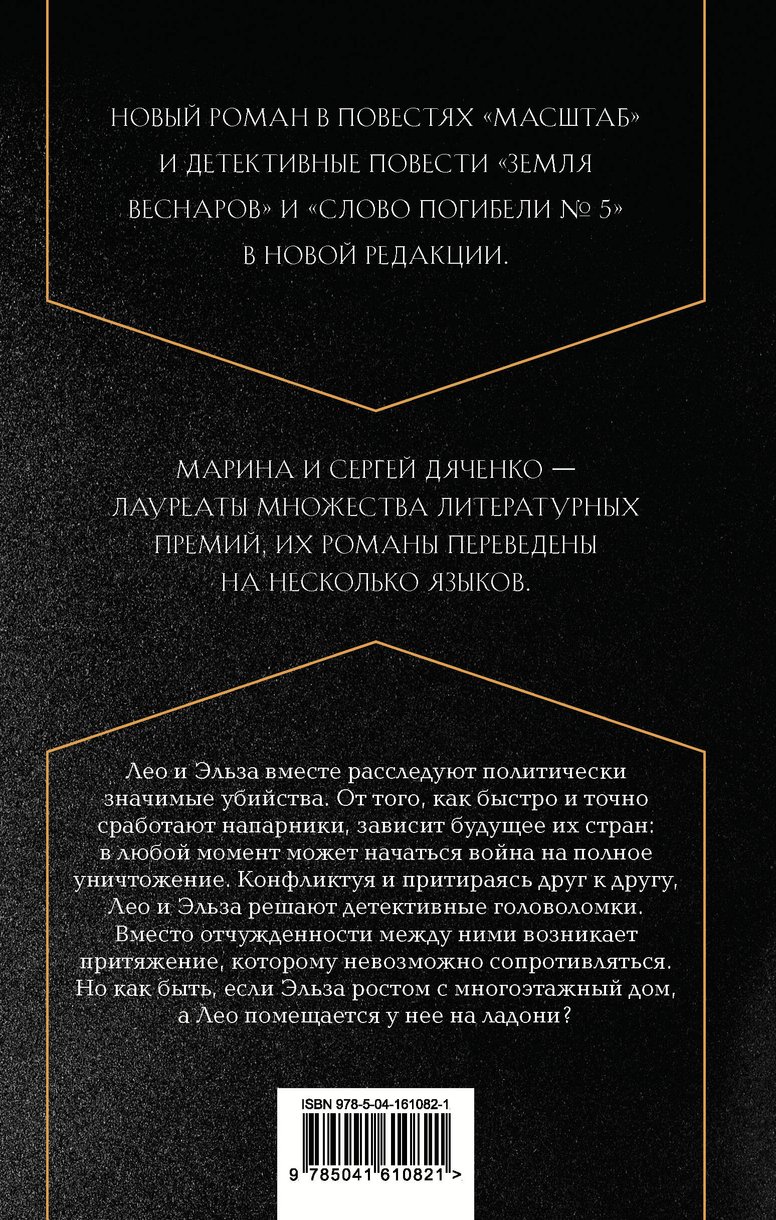Супруги Дяченко - родились в Киеве, писатели-соавторы, сценаристы, лауреаты более ста литературных премий. Последние десять лет жили в США, писали на русском языке в жанрах современной научной фантастики, фэнтези и сказки. Их книги переведены и издаются в Америке, Великобритании, Германии, Франции, Италии, Испании, Бразилии, Китае и других странах. После смерти в 2022 году Сергея Дяченко, своего мужа, друга и соавтора, Марина продолжает их общее дело, как и обещала Сергею. Новая книга посвящена расследованию необычных преступлений. Это серия детективных историй, действие которых происходит в вымышленных мирах - но мотивы и конфликты так близки нашему современнику. Кроме романа в повестях «Масштаб», который дал название сборнику, в книгу вошли детективные повести «Земля веснаров» и «Слово погибели № 5» в новой редакции.| Издательство | Эксмо |