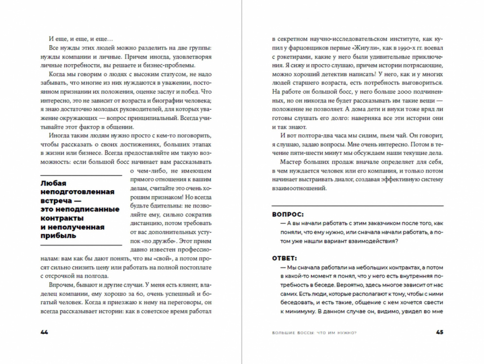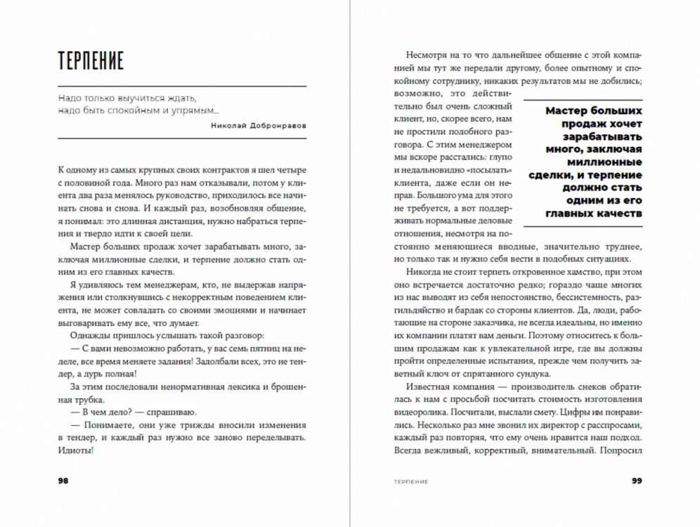 «Есть определенный потолок сделок, где-то 20-30 млн руб., который менеджеры никак не могут преодолеть. Когда речь идет о больших продажах, начинают действовать совершенно другие законы, правила, взаимоотношения, другая энергетика... Большие продажи - дело штучное, сложное, его невозможно поставить на поток, тем более не имея серьезного опыта. Эта книга - результат моего 20-летнего опыта, и цель ее - поделиться с вами знаниями, дать максимум полезной информации, которая поможет вам добиться успеха в сложных сделках, найти новые пути и методы работы, раскрыть свои уникальные возможности в больших продажах».