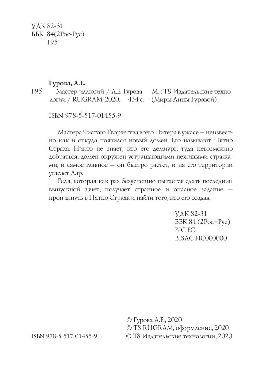 Мастера Чистого Творчества всего Питера в ужасе - неизвестно как и откуда появился новый домен. Его называют Пятно Страха. Никто не знает, кто его демиург; туда невозможно добраться; домен окружен устрашающими неживыми стражами; и самое главное - он быстро растет, и на его территории угасает Дар. Геля, которая как раз безуспешно пытается сдать последний выпускной зачет, получает странное и опасное задание - проникнуть в Пятно Страха и найти того, кто его создал...| Издательство | Т8 RUGRAM |