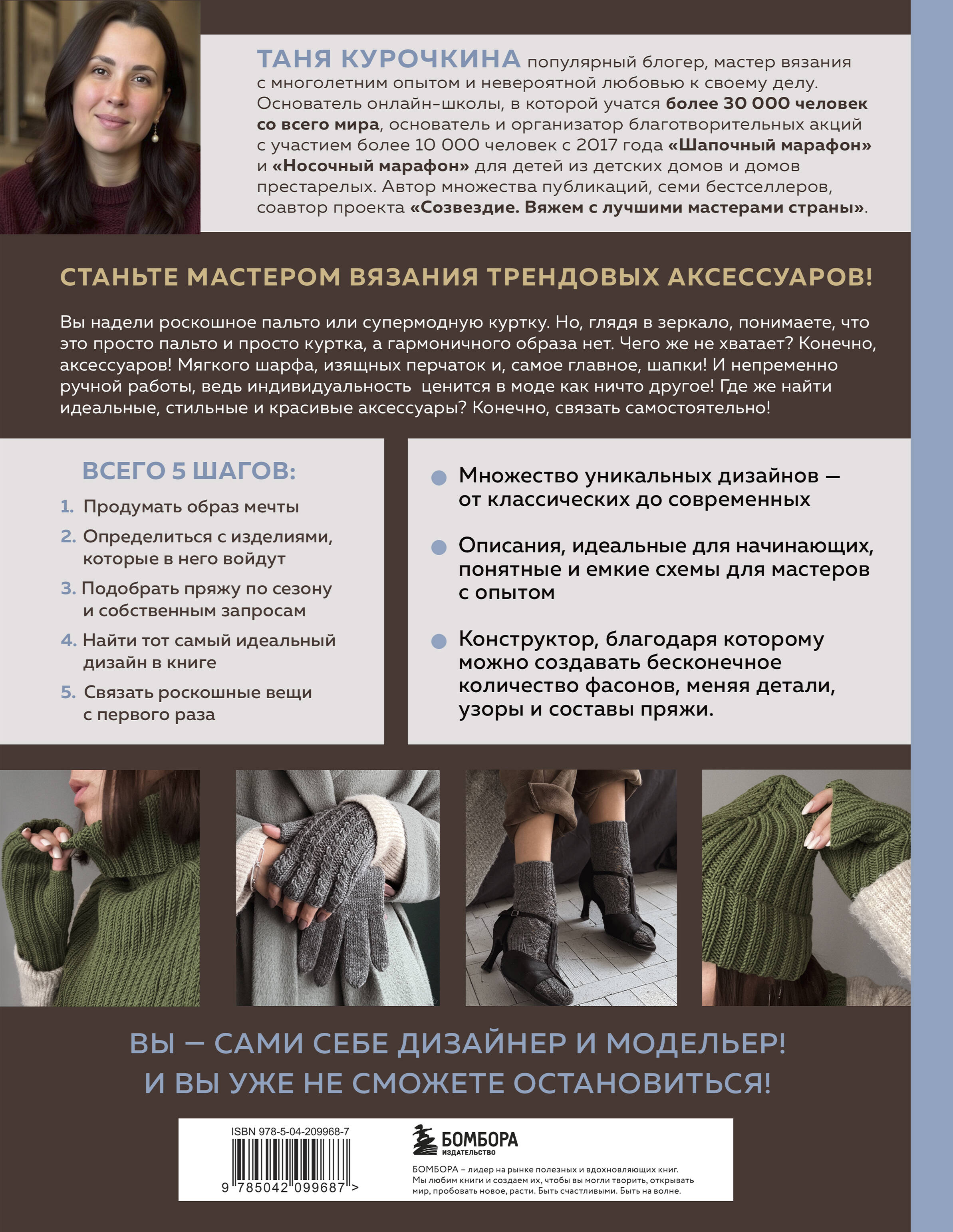 «Вязаные аксессуары - самый популярный элемент одежды любого человека, любого возраста и мировоззрения! Поэтому первое, что приходит на ум в пару к слову «вязаная» - это ШАПКА! НОСКИ! ШАРФ! ПЕРЧАТКИ! Аксессуары вяжутся быстро, начинать с них - правильно и просто. Ну и конечно, без них практически невозможен ни один стильный зимний образ современной женщины!» - так считает автор этой книги, один из лучших современных мастеров российского вязания, и щедро делится своими знаниями и потрясающим чувством стиля со всеми женщинами, которые любят вязать! Вы купили стильное пальто или супермодную шубку. Но для законченного образа этого мало! Чего же не хватает? Конечно, аксессуаров! Мягкого шарфа, теплых изящных перчаток и, самое главное, шапки! И непременно ручной работы, ведь индивидуальность ценится в моде как ничто другое! Где же найти идеальные, стильные и красивые аксессуары? Конечно, связать самостоятельно! 5 шагов к созданию аксессуаров вашей мечты: продумать будущий образ, определиться с изделиями, которые в него войдут, подобрать пряжу по сезону и собственным запросам, найти в книге тот самый, идеальный, ваш дизайн! * Множество красивейших дизайнов - от лаконичных до сложных, с яркими узорами, которые можно вписать в любое изделие. * Пошаговые инструкции по принципу «от простого к сложному», позволяющие освоить любую модель. * Доступные описания, идеальные для начинающих, по петлям и рядам, понятные и емкие схемы для мастеров с опытом. * Конструктор, благодаря которому можно создавать бесконечное количество фасонов, меняя детали, узоры и составы пряжи. Вы - сами себе дизайнер и модельер! И вы уже не сможете остановиться! Об авторе: Таня Курочкина - популярный блогер, мастер вязания с многолетним опытом и невероятной любовью к своему делу. Основатель онлайн-школы, в которой учатся более 30 000 человек со всего мира, основатель и организатор благотворительных акций «Шапочный марафон» и «Носочный марафон» для детей из детских домов и домов престарелых. Автор множества бестселлеров, соавтор проекта «Созвездие. Вяжем с лучшими мастерами страны».| Издательство | ООО "Издательство "Эксмо" |