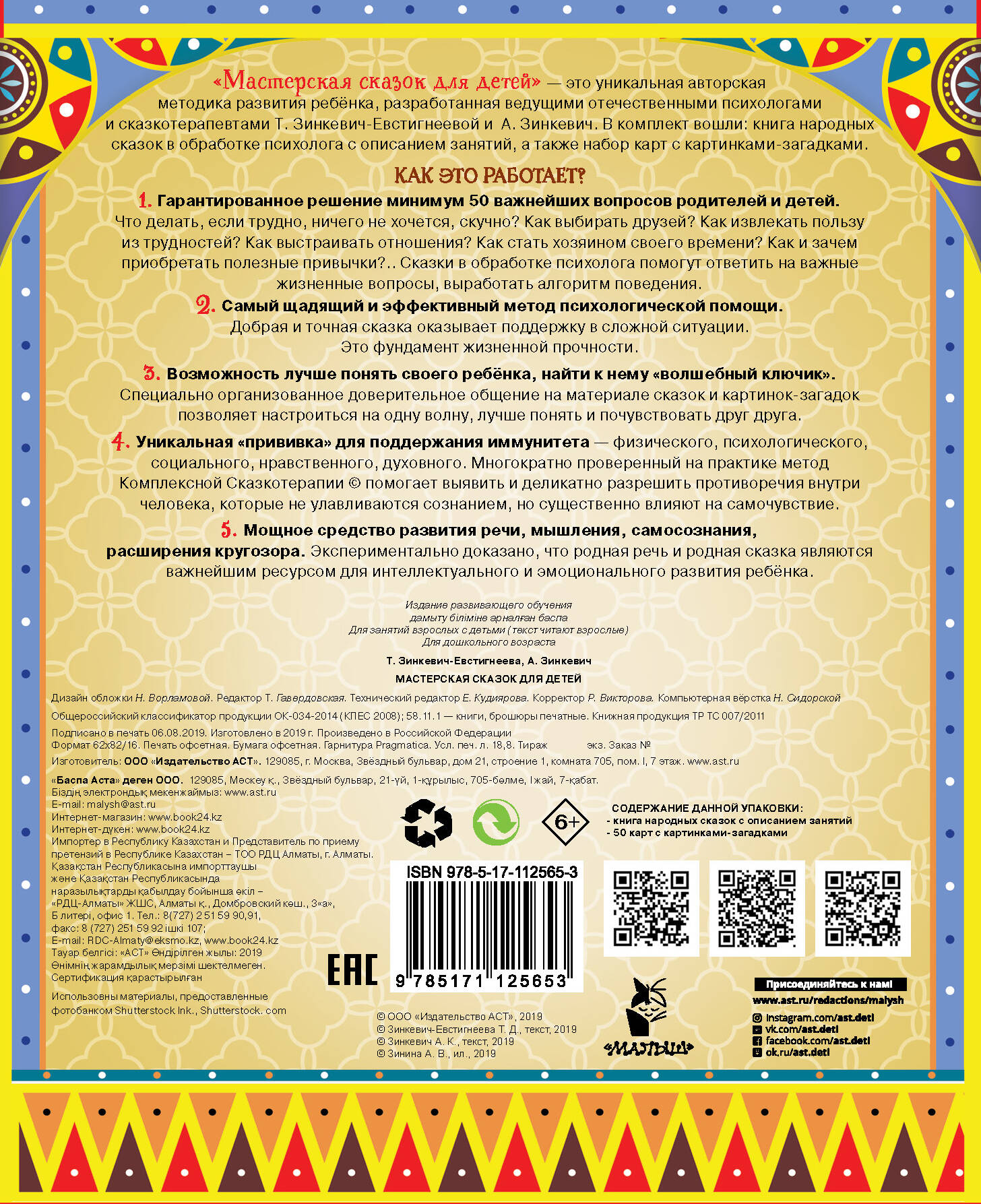 Общение со сказкой необходимо ребёнку для гармоничного развития. Это самая полезная «витаминка», которая поможет сохранить психологическое здоровье и добиться успеха в жизни. В «Мастерской сказок для детей» хранится всё необходимое, чтобы родители и дети вместе раскрыли тайны и секреты любимых народных сказок и воспользовались их богатством. Через простую и увлекательную игру с яркими карточками, через ответы на вопросы квеста можно совершить удивительные открытия, которые волшебным образом изменят жизнь к лучшему. Уникальный метод Комплексной Сказкотерапии © разработан Т. Д. Зинкевич-Евстигнеевой, доктором психологии, директором Международного института сказкотерапии, и адаптирован в этом игровом комплекте (книга и карты с картинками-загадками в яркой коробке) для самостоятельного использования родителями. Сказкотерапия - это самый легкий способ наладить доверительное общение с ребёнком, узнать, что его волнует, и помочь решить многие проблемы. Приятный бонус: занятия в «Мастерской сказок для детей» помогут развить память, мышление, сформировать навыки пересказа и красивой речи. Любимые сказки и быстрая помощь в решении психологических проблем! Пять причин купить "Мастерскую сказок для детей": 1. Здоровьесберегающие технологии для укрепления психологического иммунитета ребёнка. 2. Увлекательная форма экспериментариума, лаборатории, мастерской. Эффективное современное развитие ребёнка. 3. Уникальная авторская методика психологической помощи адаптирована для любого неподготовленного пользователя. 4. Значительно дешевле курса психотерапии со специалистом и зачастую не менее результативно. 5. Интересная игра-квест для прекрасного времяпрепровождения в кругу семьи. Полезный и красивый подарок.| Издательство | Издательство "АСТ" |