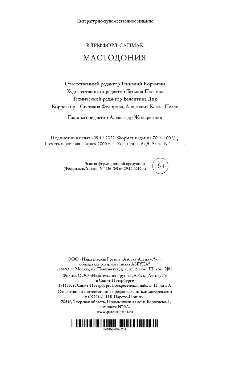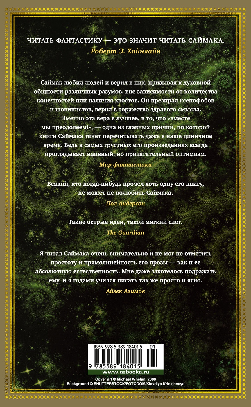 Клиффорд Саймак - один из отцов-основателей современной фантастики, писателей-исполинов, благодаря которым в американской литературе существует понятие «золотой век НФ». В начале литературной карьеры Саймак писал «твердые» научно-фантастические и приключенческие произведения, а также вестерны, но затем раздвинул границы жанра НФ и создал свой собственный стиль, который критики называли мягким, гуманистическим и даже пасторальным, сравнивая прозу Саймака с прозой Рэя Брэдбери. За пятьдесят пять лет Саймак написал около тридцати романов и более ста двадцати повестей и рассказов. Награждался премиями «Хьюго», «Небьюла», «Локус» и другими. Удостоен звания «Грандмастер премии "Небьюла"». В этот сборник вошли четыре романа, относящиеся к позднему этапу творчества Клиффорда Саймака. Роман «Мастодония» публикуется в новом переводе.| Издательство | Азбука |