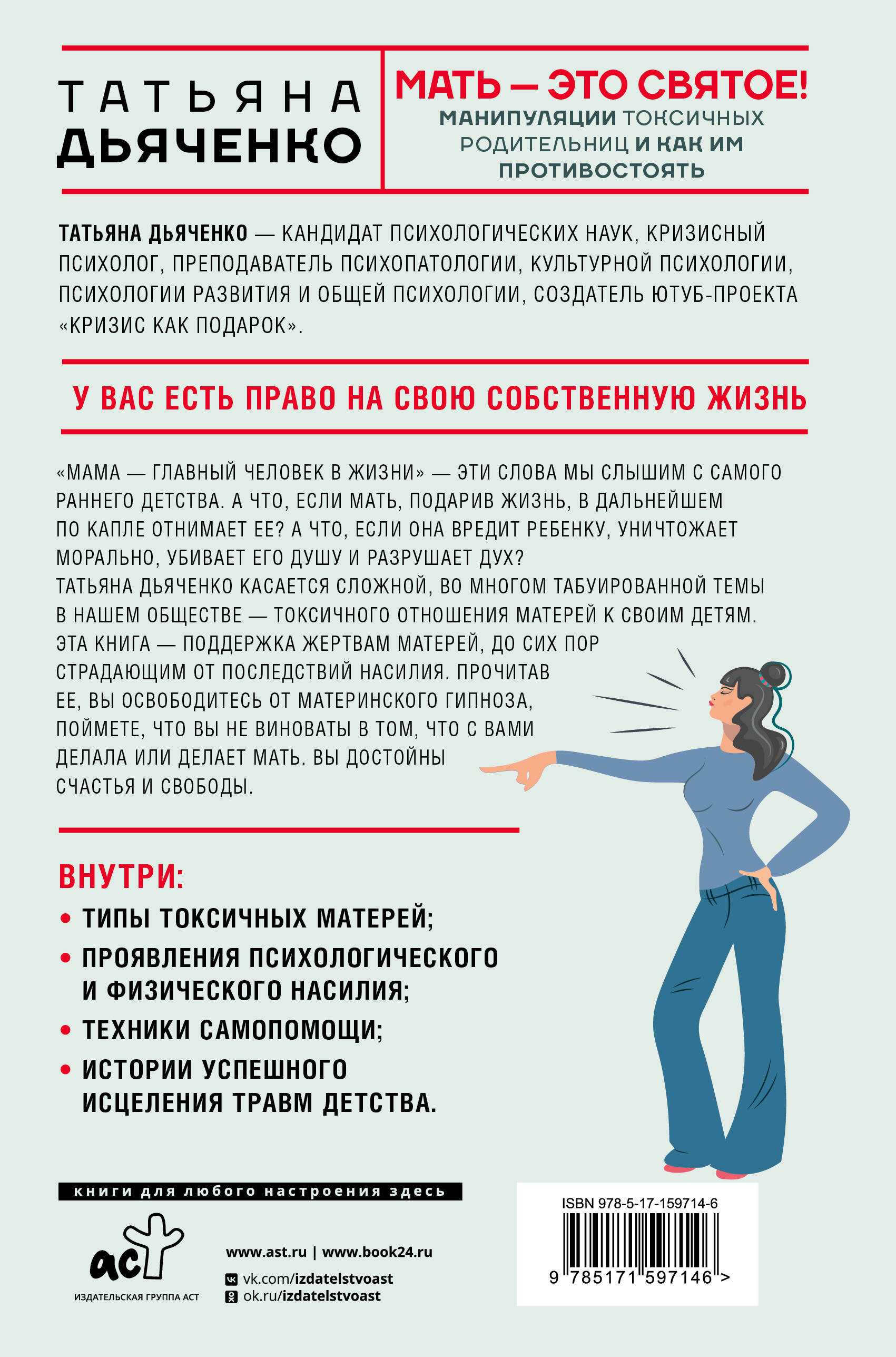 Татьяна Дьяченко - кандидат психологических наук, кризисный психолог, преподаватель психопатологии, культурной психологии, психологии развития и общей психологии, создатель ютуб-проекта "Кризис как подарок". "Мама - главный человек в жизни" - эти слова мы слышим с самого раннего детства. А что, если мать, подарив жизнь, в дальнейшем по капле отнимает ее? А что, если она вредит ребенку, уничтожает морально, убивает его душу и разрушает дух? Татьяна Дьяченко касается сложной, во многом табуированной темы в нашем обществе - токсичного отношения матерей к своим детям. Эта книга - поддержка жертвам матерей, до сих пор страдающим от последствий насилия. Прочитав ее, вы освободитесь от материнского гипноза, поймете, что вы не виноваты в том, что с вами делала или делает мать. Вы достойны счастья и свободы. Внутри: • типы токсичных матерей; • проявления психологического и физического насилия; • техники самопомощи; • истории успешного исцеления травм детства.| Издательство | Издательство "АСТ" |