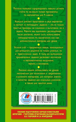 В пособии представлен материал, который поможет сформировать навыки устного счета по базовым темам программы по математике для 4 класса.