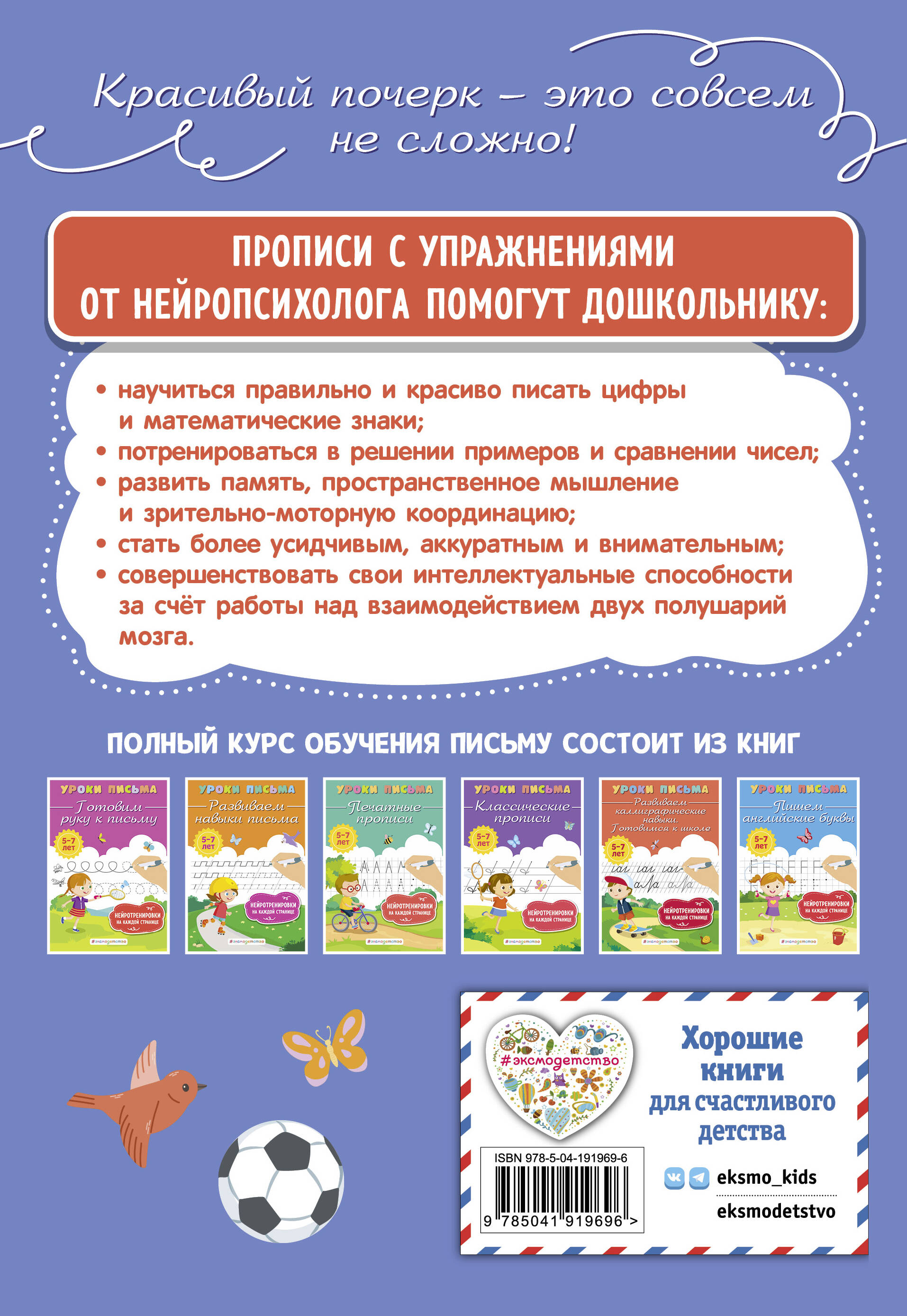 Пособие предназначено для детей, готовящихся к поступлению в школу, и представляет собой математические прописи, в которых использованы как традиционные задания, так и нейропсихологические упражнения для обучения и развития дошкольника. Книга поможет ребенку укрепить руку, научиться правильно и красиво писать цифры и математические знаки; потренироваться в решении примеров и сравнении чисел; развить память, пространственное мышление и зрительно-моторную координацию, совершенствовать свои интеллектуальные способности за счет работы над взаимодействием двух полушарий мозга; стать более усидчивым и аккуратным. Обучение по прописям для дошкольников построено так, чтобы ребенок не скучал и не утомлялся. Разнообразные упражнения позволяют переключаться с одного вида деятельности на другой и таким образом будут способствовать заинтересованности ребенка. Задания соответствуют возрастным особенностям ребенка и сформулированы максимально просто, понятно и доступно. За счет активации обоих полушарий мозга ребенок быстро освоит навык письма и будет писать цифры ровно и красиво.| Издательство | ООО "Издательство "Эксмо" |