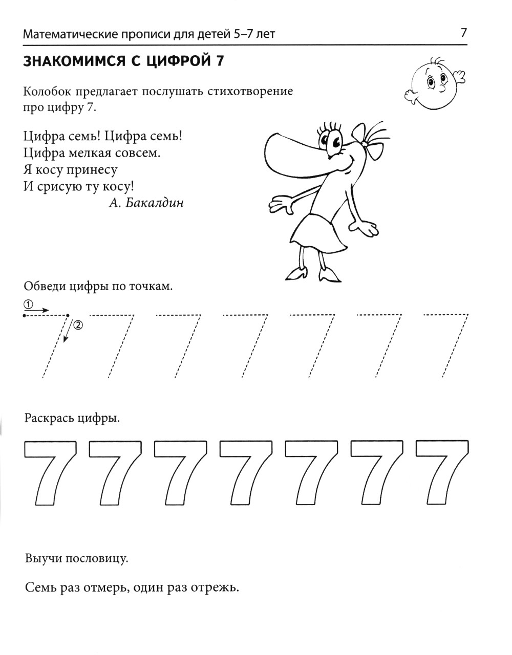 Предложенные в прописях задания помогут подготовить руку ребёнка к письму, закрепить полученные ранее знания, умения и навыки, а также применить их для выполнения более сложных упражнений: письмо цифр, математических знаков, геометрических фигур в тетради в клетку, рисование символических изображений предметов и т.д. В процессе выполнения заданий весёлого Колобка и его друзей-карандашей у ребёнка развиваются внимание, память, мышление - качества, необходимые для обучения в школе. Выполнение заданий в тетради решает одну из задач современного обучения - формирование предпосылок учебной деятельности, к которым относятся: понимание предложенной задачи; умение самостоятельно её выполнить; проведение самоконтроля и самооценки выполненной работы. В издании учтены требования ФГОС ДО И ФОП ДО. Математические прописи для детей 5-7 лет входят в дополнительный комплект организационно-методического сопровождения парциальной образовательной программы «Математические ступеньки» и предназначены для совместной работы взрослого с ребёнком.| Издательство | Творческий центр Сфера |