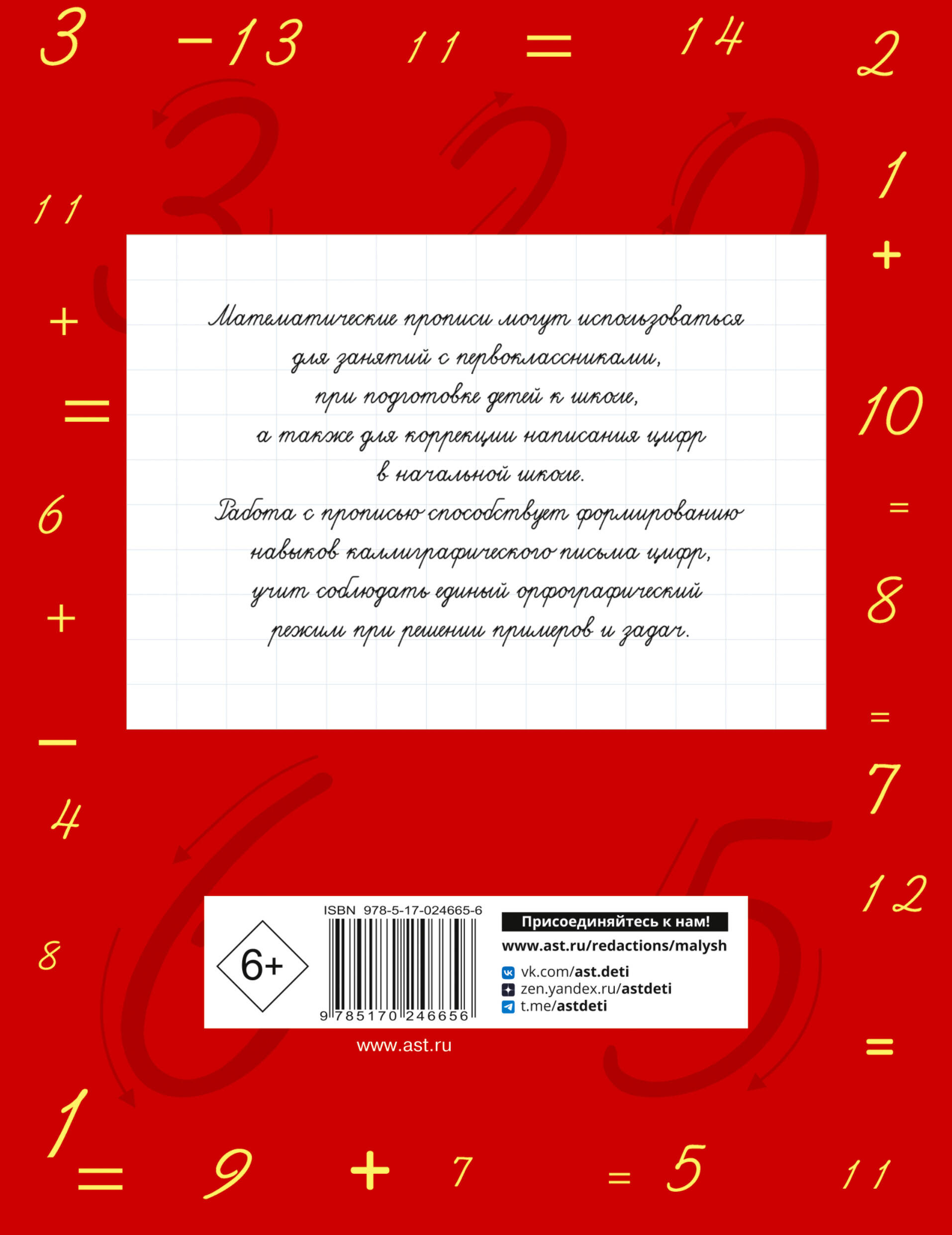 Математические прописи могут использоваться для занятий с первоклассниками, при подготовке детей к школе, а также для коррекции написания цифр в начальной школе. Работа с прописями способствует формированию навыков каллиграфического написания цифр, учит соблюдать единый орфографический режим при решении примеров и задач. Для младшего школьного возраста. О. В. Узорова и Е.А Нефёдова - известные педагоги-практики, авторы самых издаваемых учебников и учебных пособий в России. Основанные на авторской методике, доказавшей свою эффективность миллионными тиражами, эти пособия помогут родителям подготовить ребенка к школе, а ученикам - легко и эффективно освоить программу начальной школы. Все, что поможет ребенку стать успешным в учёбе, вы найдёте в книгах Узоровой и Нефёдовой: подготовка к школе, прописи, прописи для детей, прописи для дошкольников, учимся читать, развитие речи, тексты для 1 класса, контрольное списывание, диктанты по русскому языку, подготовка к диктантам, задания по русскому языку, тесты по русскому языку, примеры по математике, сложение, вычитание, задания по математике, задачи по математике, контрольная работа, самостоятельная работа, проверочные работы, тесты по математике, математические диктанты, устный счёт, счёт в пределах 20, справочное пособие, рабочая тетрадь, комплект рабочих тетрадей, решаем примеры, решаем задачи, тренинг, разные виды сложности, сборники заданий, комплексные работы, летние задания, 1 класс, возраст 4-7 лет.| Издательство | АСТ |
