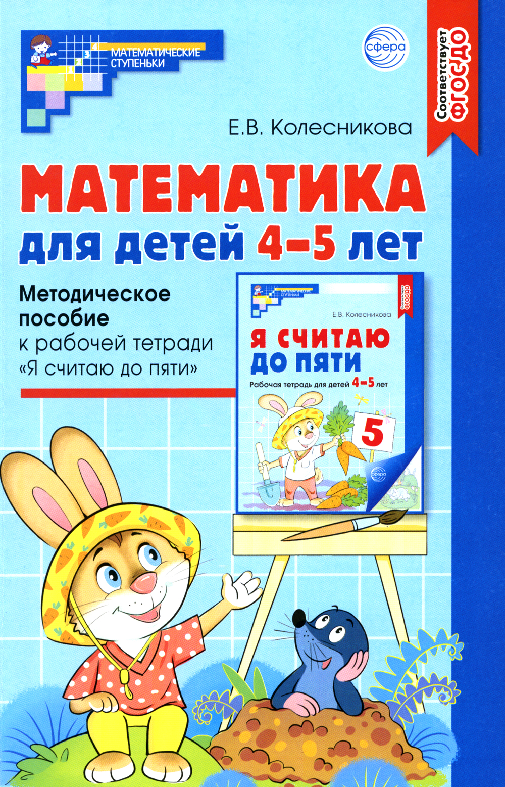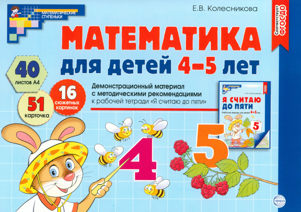Комплект «Математические ступеньки» для младшей группы детского сада - готовое решение для занятий по математическому развитию детей на целый год. В комплект для младшей группы (детей 4-5 лет) вошли методическое пособие для педагога с подробными сценариями учебно-игровых занятий по развитию математических представлений, папка с демонстрационным материалом и 30 цветных рабочих тетрадей для выполнения заданий детьми. Комплект состоит из: - Я считаю до пяти. ЦВЕТНАЯ. Рабочая тетрадь для детей 4-5 лет - 30 шт; - Математика для детей 4-5 лет: Метод. пособие к рабочей тетради «Я считаю до пяти»; - Математика для детей 4-5 лет. Демонстрационный материал (40 цв.л. А4 + брошюра 24 с.).| Издательство | Творческий центр Сфера |
