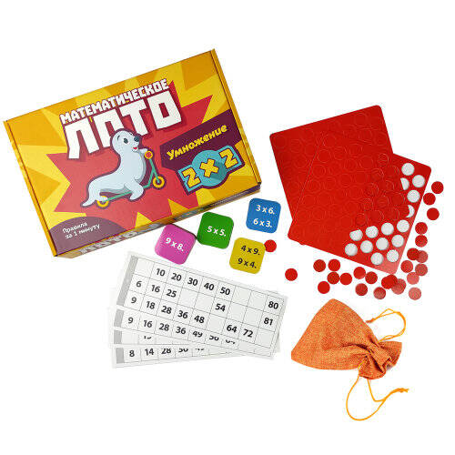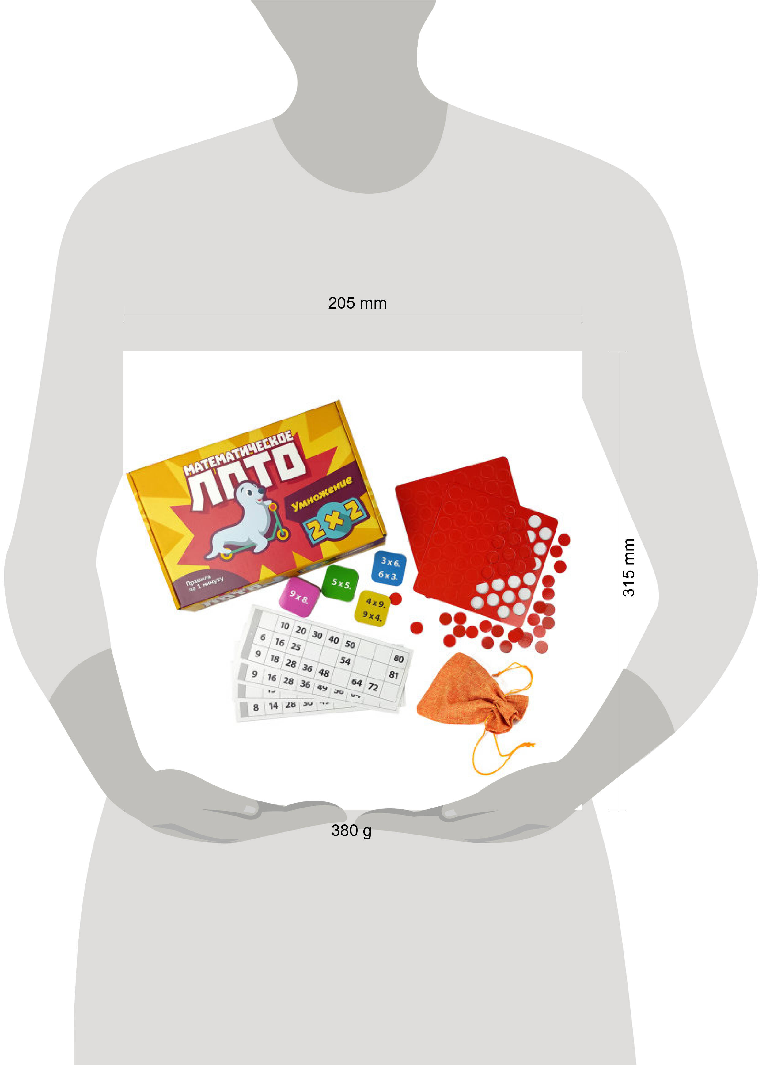 Настольная игра "Математическое лото. Таблица умножения". Всем известное и всеми нами любимое ЛОТО в новой форме увлекательной математики! Выигрывает тот, кто быстрее всех закроет фишками все поля на своей карточке. Запомнить таблицу умножения легко и просто! Будьте внимательны - от этого зависит ваша победа в ИГРЕ! Комплектация: 84 красных фишки (расположены на двух планшетах). Перед началом первой игры их нужно аккуратно выдавить. 22 красные квадратные фишки. Перед началом первой игры их нужно аккуратно выдавить. Это фишки с возможными 2-мя комбинациями. 6 зелёных квадратных фишек. Перед началом первой игры их нужно аккуратно выдавить. Это фишки с возможной 1-ой комбинацией. 6 синих квадратных фишек. Перед началом первой игры их нужно аккуратно выдавить. Это фишки с возможными 4-мя комбинациями. 2 желтые квадратные фишки. Перед началом первой игры их нужно аккуратно выдавить. Это фишки с возможными 3-мя комбинациями. 1 холщовый мешочек. 20 игровых карточек с цифрами| Издательство | Правильные игры ООО |