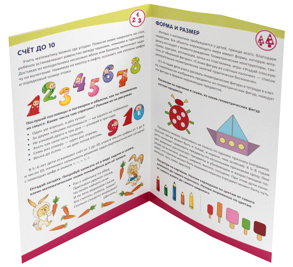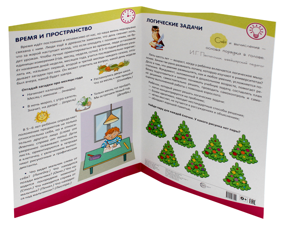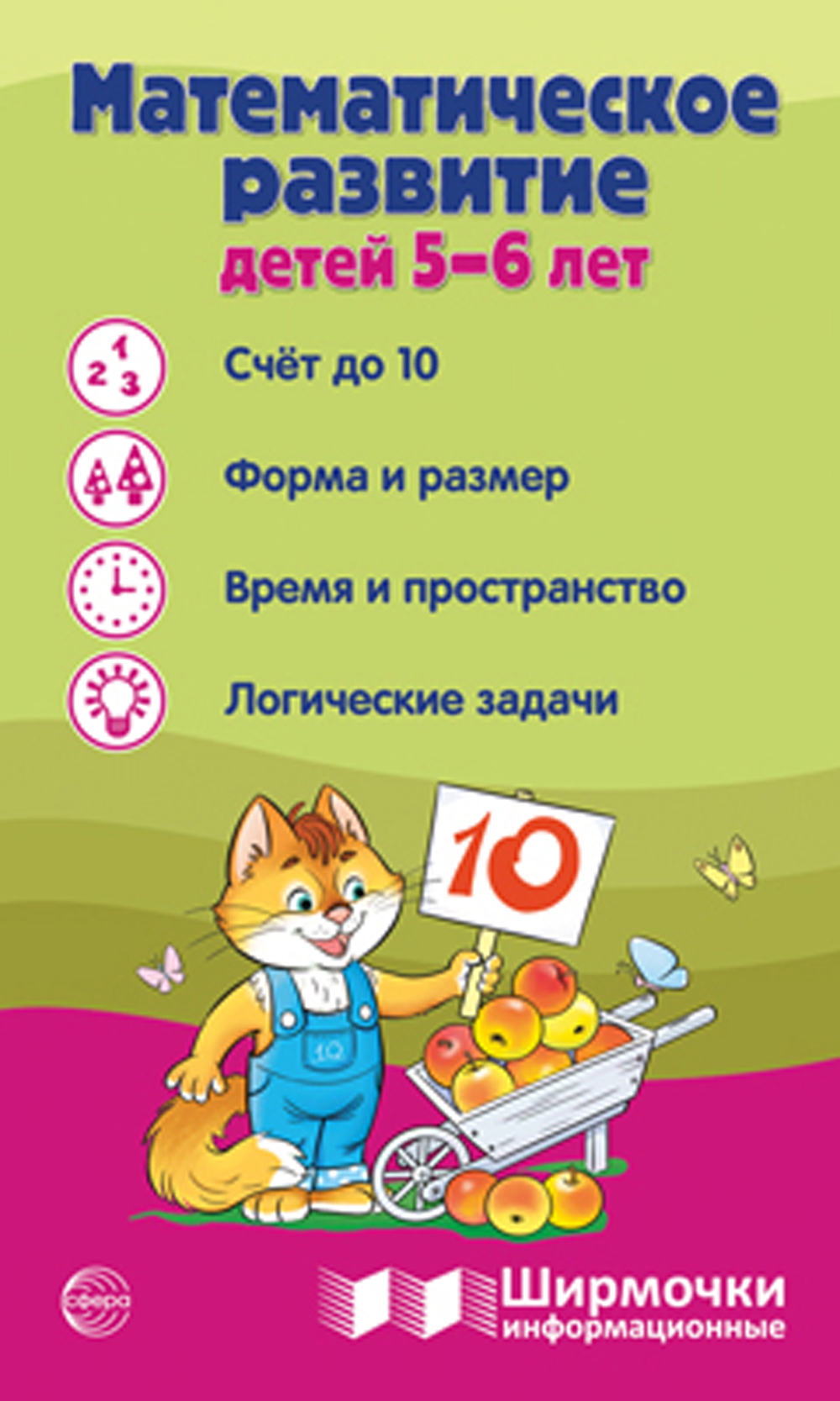 В ширмочке рассказывается о том, как изучать математику в играх и в повседневной жизни, какие математические темы и термины уже доступны для понимания в 5-6 лет. Информация разбита на блоки, соответствующие разделам математики: «Количество и счёт». «Форма и размер», «Время и пространство», «Логические задачи». Дети выучат цифры и счёт до 10, будут решать задачи по картинкам, научатся видеть геометрические фигуры в предметах окружающего мира, запомнят месяцы года, дни недели и потренируются в ориентировке на листе бумаги и сравнении предметов по величине. Яркие иллюстрации, весёлые пословицы, загадки, логические игры облегчат усвоение непростых математических тем и терминов.| Издательство | Творческий центр Сфера |