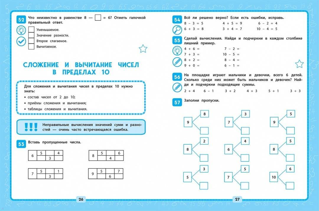 Азы математической грамотности закладываются в начальной школе. На этом этапе очень важно устранить причины ошибок, которые часто допускаются при вычислениях или математических рассуждениях. В тренажёре даны задания для предотвращения или исправления наиболее распространённых ошибок по всем темам, изучаемым в 1 классе. Ученик может определить уровень своих знаний по каждой из тем и отработать те из них, где у него обозначились проблемы. Задания разного уровня сложности позволяют закрепить вычислительные навыки и самостоятельно находить ошибки. Отдельные задания снабжены подсказками и ответами. Выполняя задания тренажёра, первоклассник: • самостоятельно оценит уровень своих знаний и добьётся его повышения; • сформирует осознанный навык поиска нужной информации; • получит первый опыт оценки проделанной работы; • повысит успеваемость по математике.