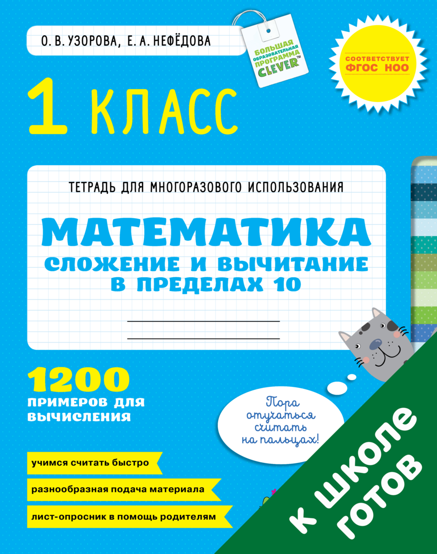 Тетрадь для многоразового использования «Математика. 1 класс. Сложение и вычитание в пределах 10. 1200 примеров для вычисления» может стать одной из первых обучающих тетрадей для вашего ребенка. Ориентирована тетрадь на детей 6-7 лет, готовящихся к школе, и на первоклассников. Как отучить ребенка считать на пальцах? Для этого необходимо научить его быстро складывать и вычитать в уме. Этот навык можно развить только решением многочисленных примеров. Разнообразие подачи примеров в новой многоразовой тетради «Математика. 1 класс. СЛОЖЕНИЕ И ВЫЧИТАНИЕ В ПРЕДЕЛАХ 10» не даст малышу соскучиться и поможет ему легче ориентироваться и быть успешным в разнообразных формах контрольных, проверочных работ и мониторингов, проводимых в 1 классе. Цель нашей тетради: доведение до автоматизма навыка счета в пределах 10 при помощи игры. А прекрасных результатов можно достичь уже за неделю, занимаясь с ребенком всего по 5-10 минут ежедневно.