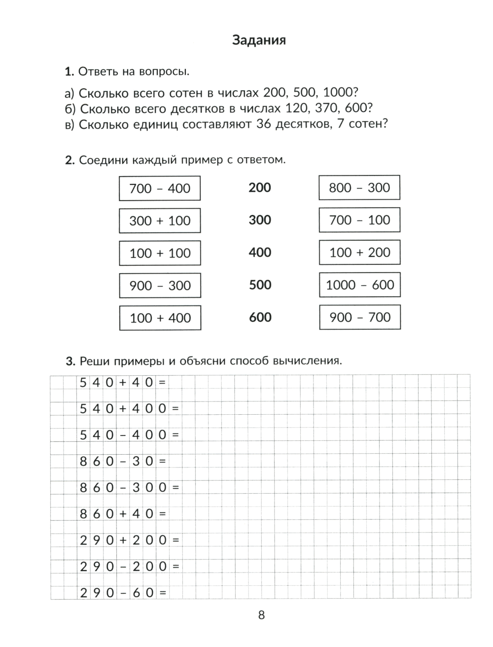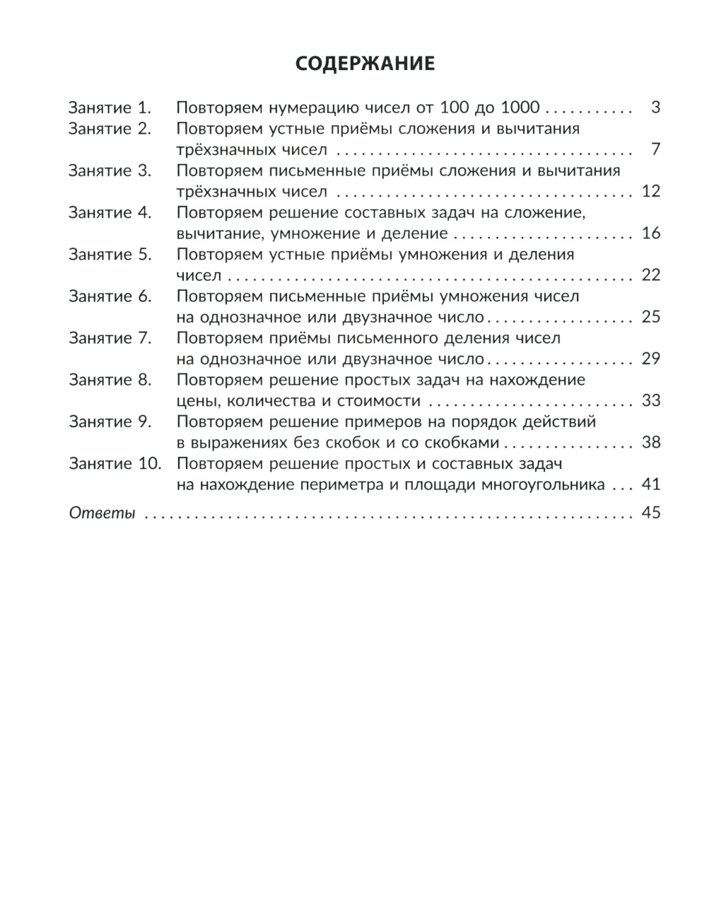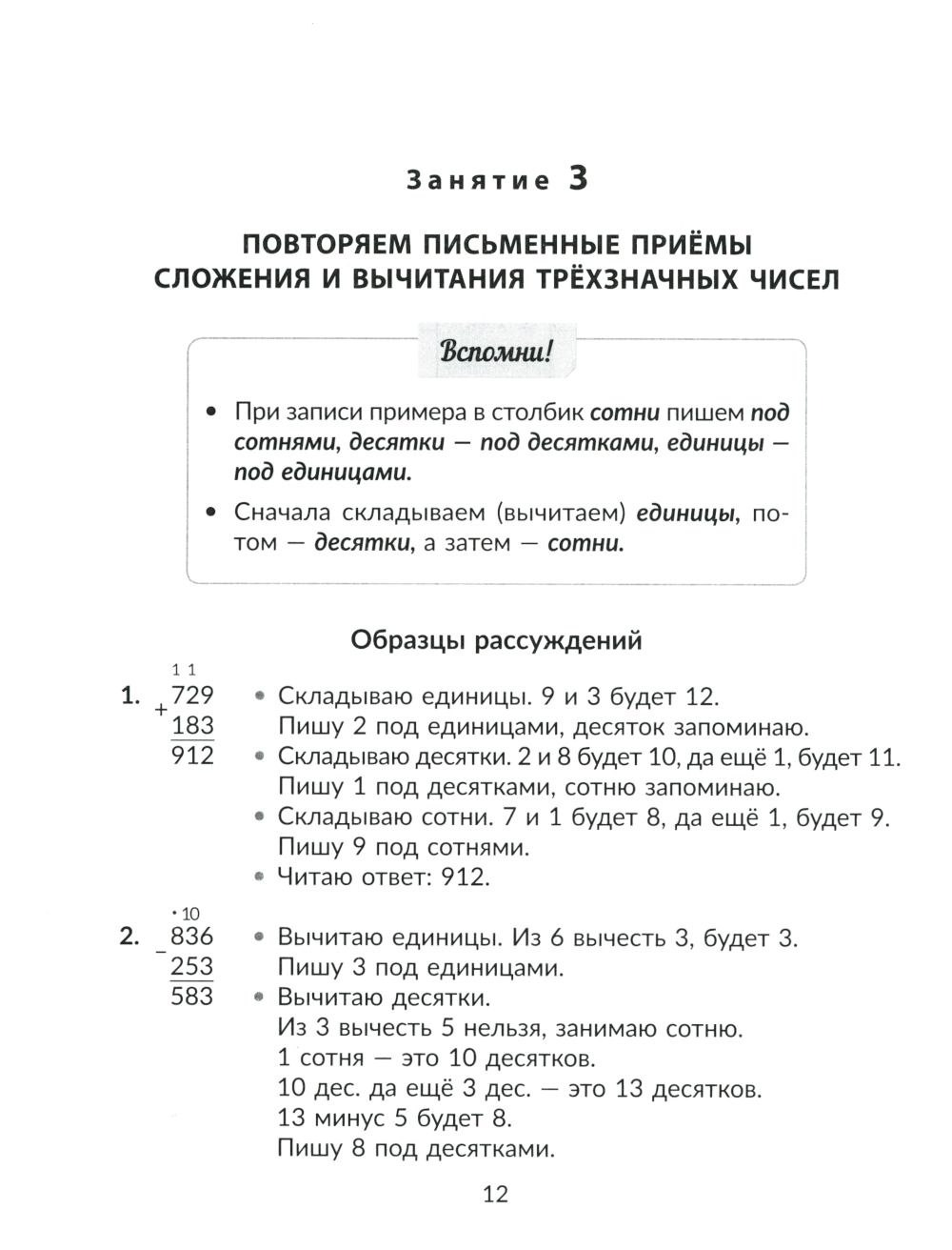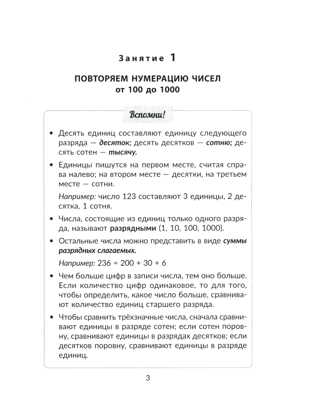 В книге представлены с простыми объяснениями и наглядными примерами самые важные и сложные темы учебной программы для 3 класса. Такими темами являются: нумерация чисел от 100 до 1000, устные и письменные приёмы сложения и вычитания трёхзначных чисел; приёмы составных задач на сложение, вычитание, умножение и деление; решение простых задач на нахождение цены, количества и стоимости; решение примеров на порядок действий; нахождение периметра и площади многоугольника и др. В качестве тренировочных упражнений к каждой теме даны задания для самостоятельного выполнения и ответы к ним. В рабочей тетради также есть задания для смекалистых. Книга прекрасно подойдёт для дополнительных домашних занятий с третьеклассниками.
