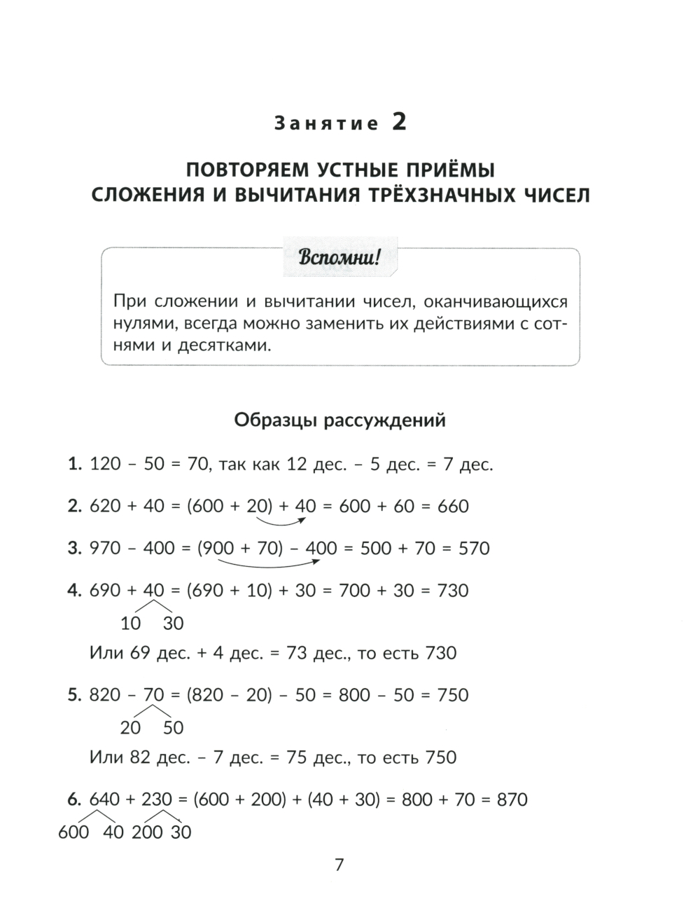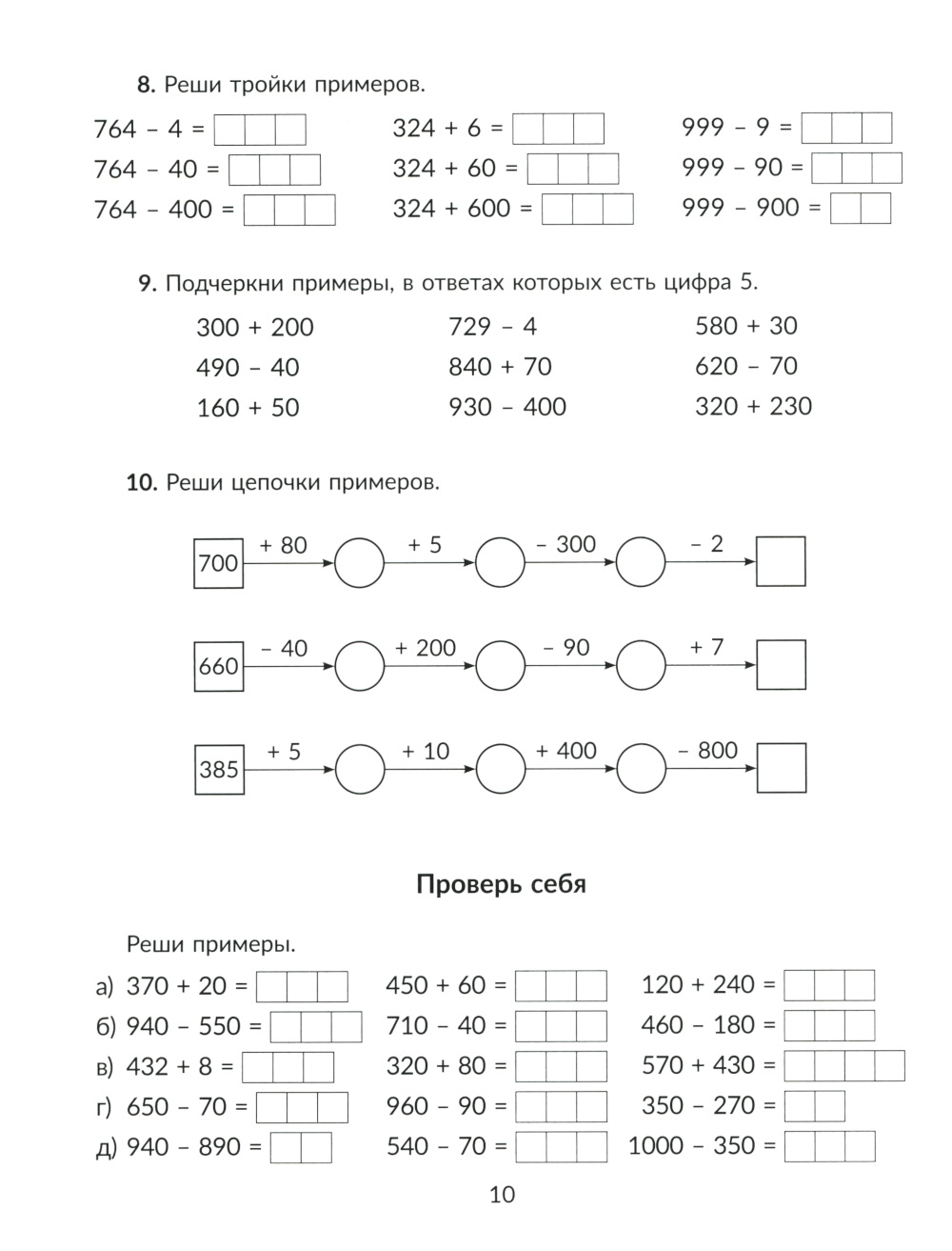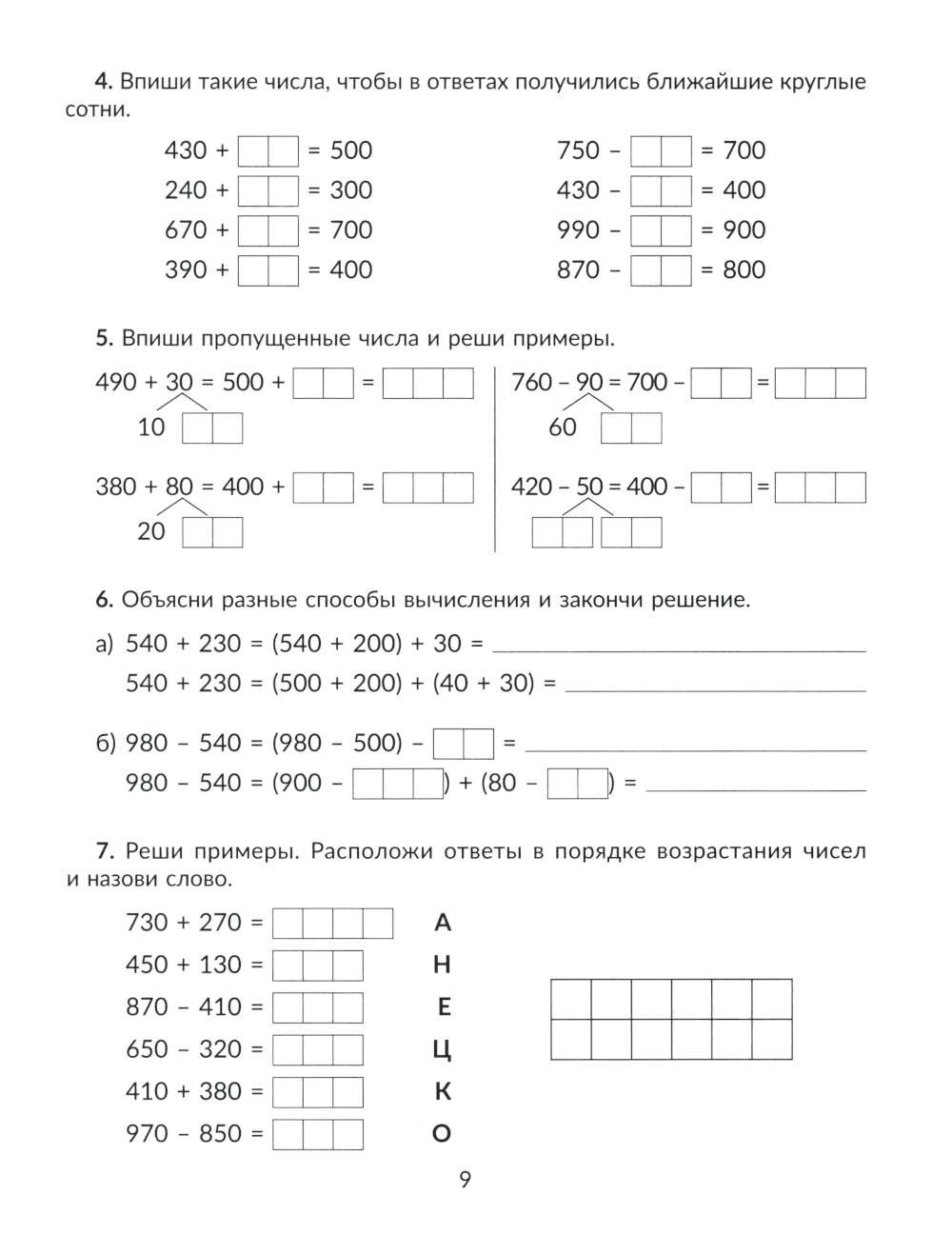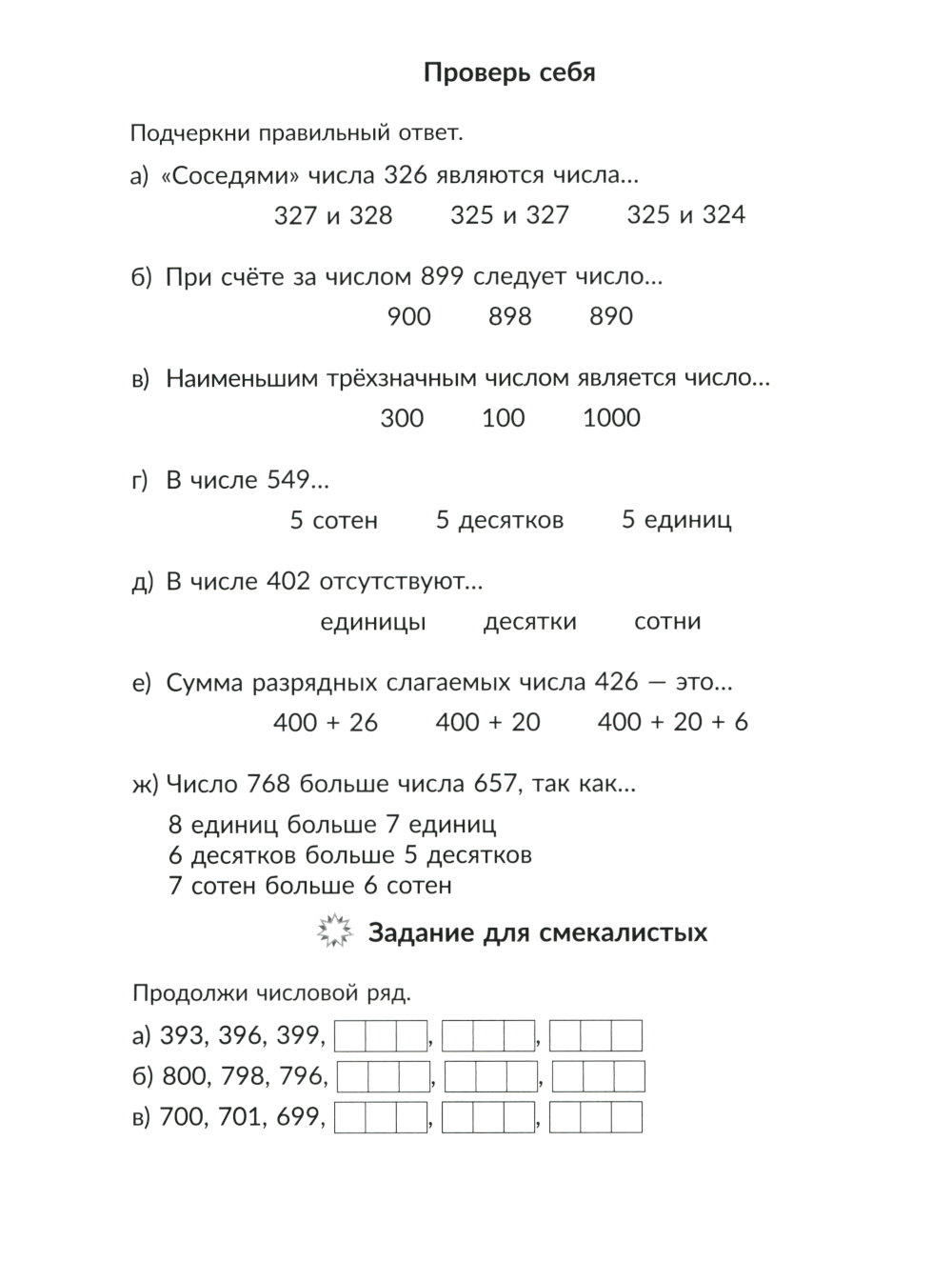 В книге представлены с простыми объяснениями и наглядными примерами самые важные и сложные темы учебной программы для 3 класса. Такими темами являются: нумерация чисел от 100 до 1000, устные и письменные приёмы сложения и вычитания трёхзначных чисел; приёмы составных задач на сложение, вычитание, умножение и деление; решение простых задач на нахождение цены, количества и стоимости; решение примеров на порядок действий; нахождение периметра и площади многоугольника и др. В качестве тренировочных упражнений к каждой теме даны задания для самостоятельного выполнения и ответы к ним. В рабочей тетради также есть задания для смекалистых. Книга прекрасно подойдёт для дополнительных домашних занятий с третьеклассниками.