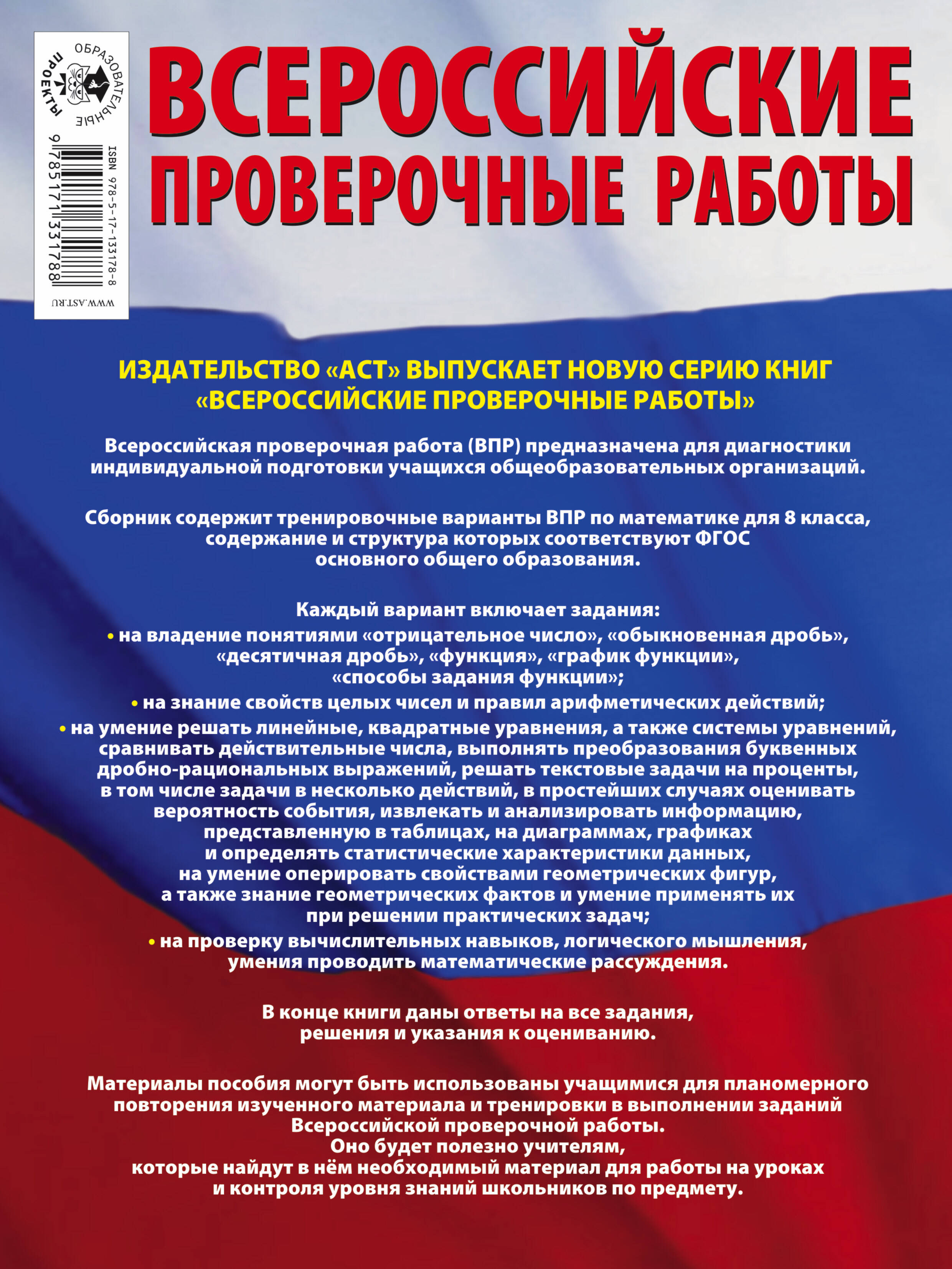 Данное пособие предназначено для учащихся 8-х классов общеобразовательных организаций. Оно позволяет в кратчайшие сроки проверить свои знания, потренироваться в выполнении заданий и тем самым успешно подготовиться к выполнению Всероссийской проверочной работы по математике по итогам обучения в 8-м классе. Пособие содержит 15 тренировочных вариантов проверочных работ. Содержание проверочной работы соответствует Федеральному государственному образовательному стандарту основного общего образования. Каждый вариант составлен в полном соответствии с демонстрационным вариантом, представленном на информационных порталах по Всероссийским проверочным работам: www.vpr.statgrad.org и www.fioco.ru. В конце книги даны ответы на все задания, решения и указания к оцениванию. Материалы пособия будут полезны учителям, которые найдут в нём материал для работы на уроках и контроля уровня знаний школьников по предмету.| Издательство | ИЗДАТЕЛЬСТВО "АСТ" |