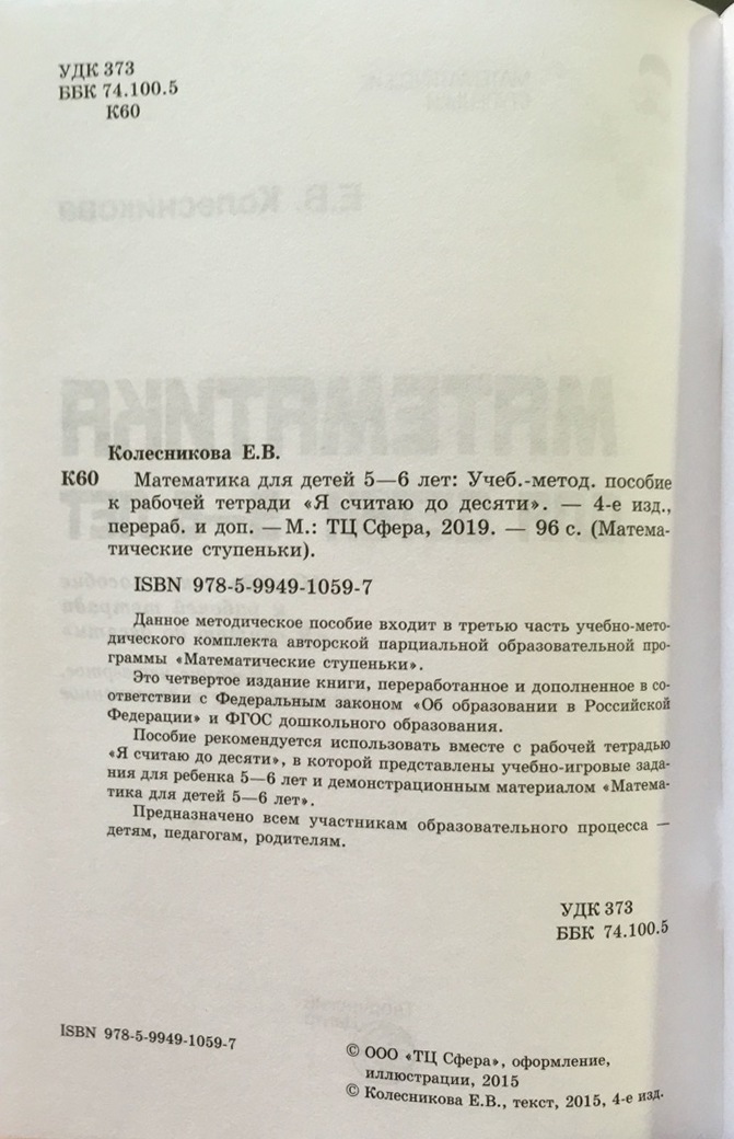 Пособие по формированию элементарных математических представлений - часть учебно-методического комплекта к программе "Математические ступеньки". Является учебно-методическим пособием к рабочей тетради "Я считаю до десяти". Предназначено для работы с детьми 5-6 лет. Через систему увлекательных игр и упражнений дети познакомятся с числами и цифрами до 10, математическими знаками, расширят свои знания о временах года и частях суток, геометрических фигурах, научатся решать логические задачи. В данное издание внесены изменения в соответствии с федеральными государственными требованиями к структуре основной общеобразовательной программы дошкольного образования.