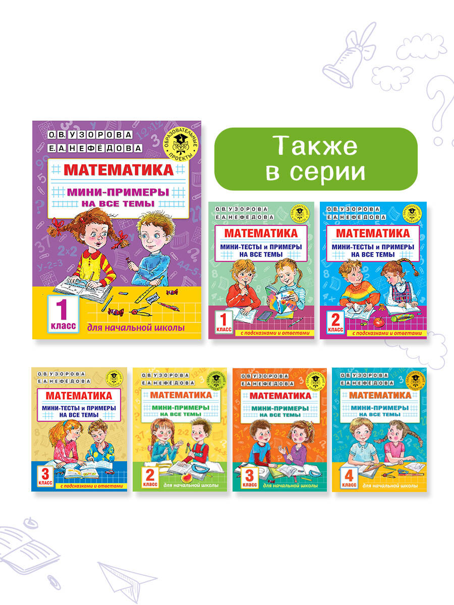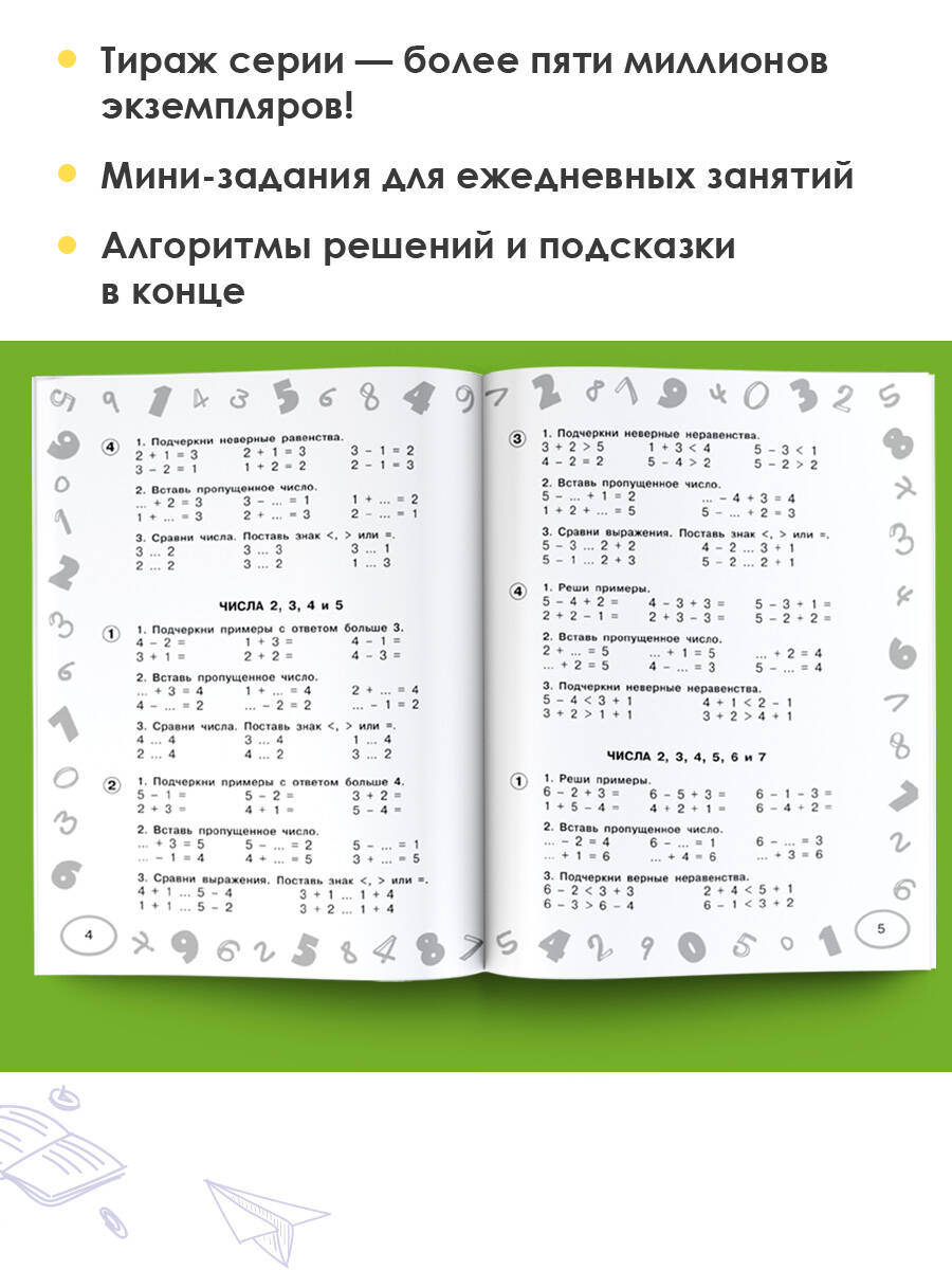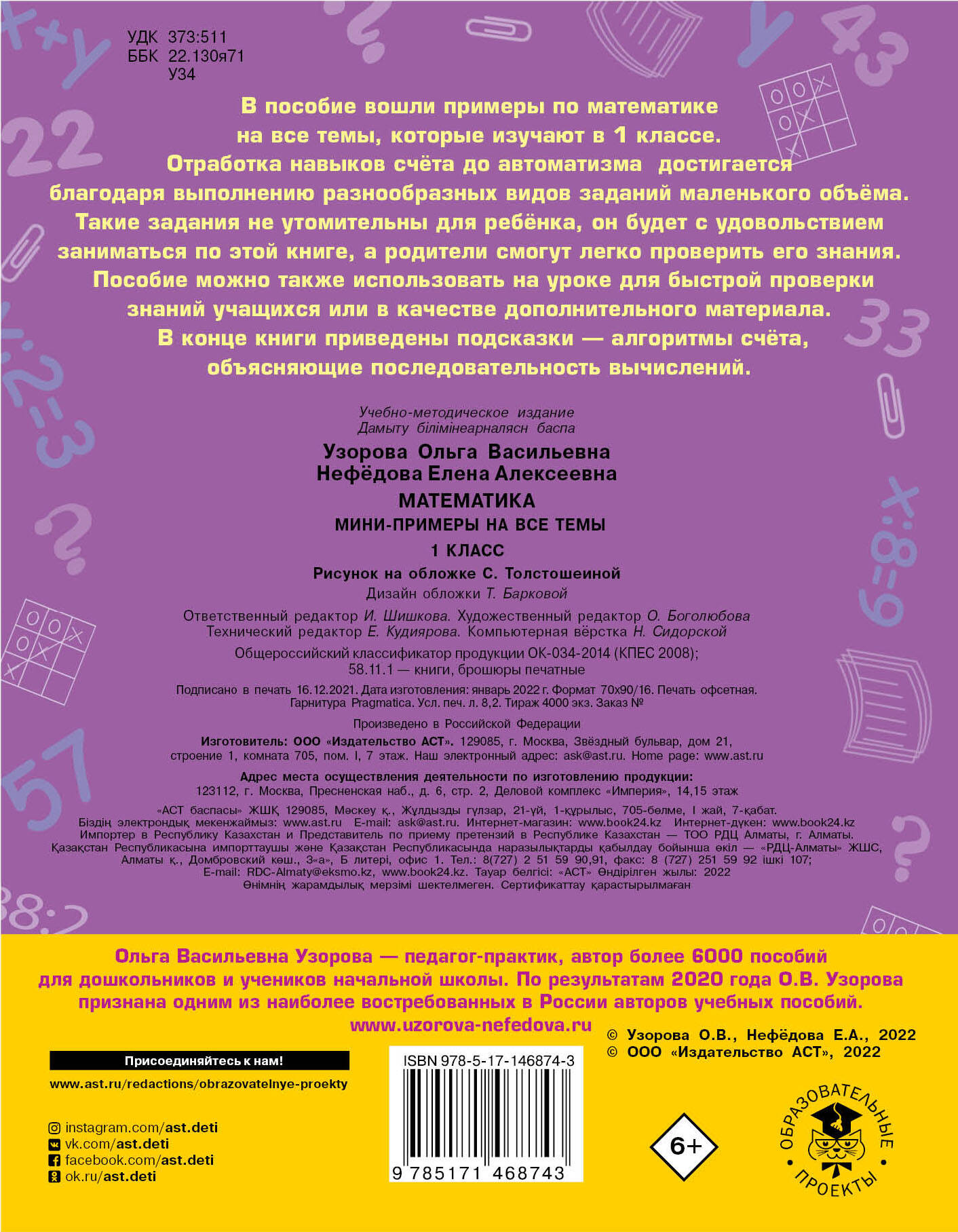 В пособие вошли примеры по математике на все темы, которые изучают в 1 классе. Отработка навыков счёта до автоматизма достигается благодаря выполнению разнообразных видов заданий. В конце книги приведены подсказки - алгоритмы счёта, объясняющие последовательность вычислений. Маленький объем заданий не утомителен для ребёнка, и он будет с удовольствием заниматься по этой книге, а родители смогут легко проверить его знания. Такие задания также удобно использовать на уроке для мини-контрольной или в качестве дополнительного материала. Книга пригодится на уроках математики, для работы дома с родителями и станет незаменимым помощником для репетиторов.| Издательство | ИЗДАТЕЛЬСТВО "АСТ" |