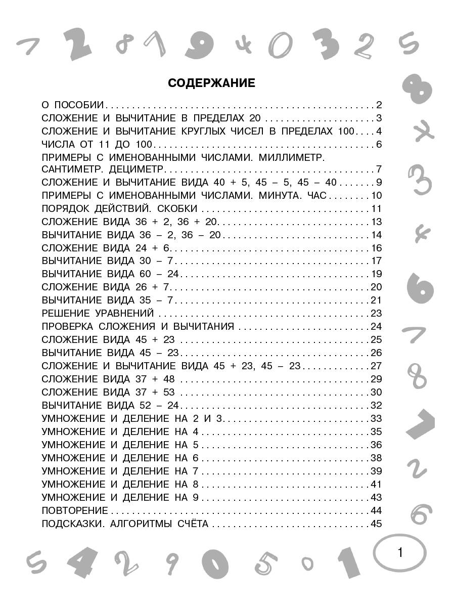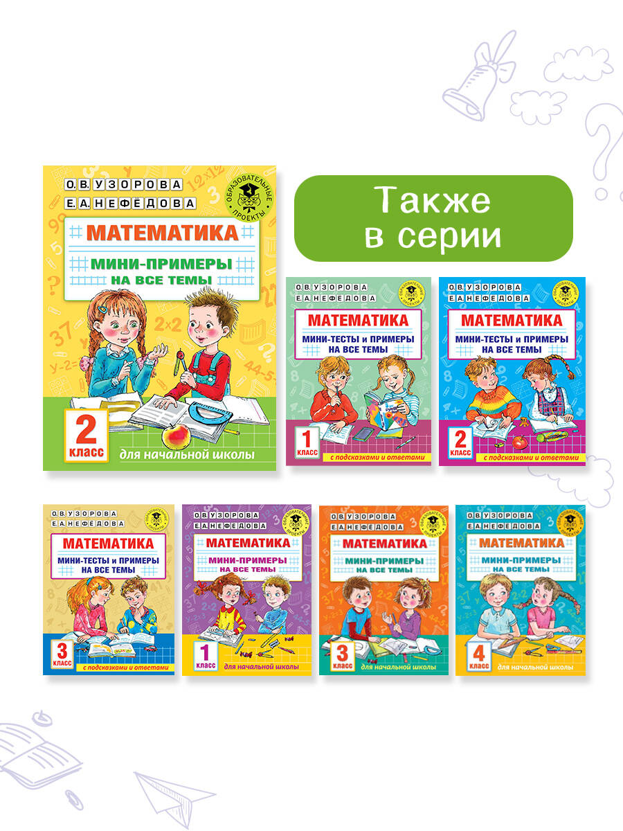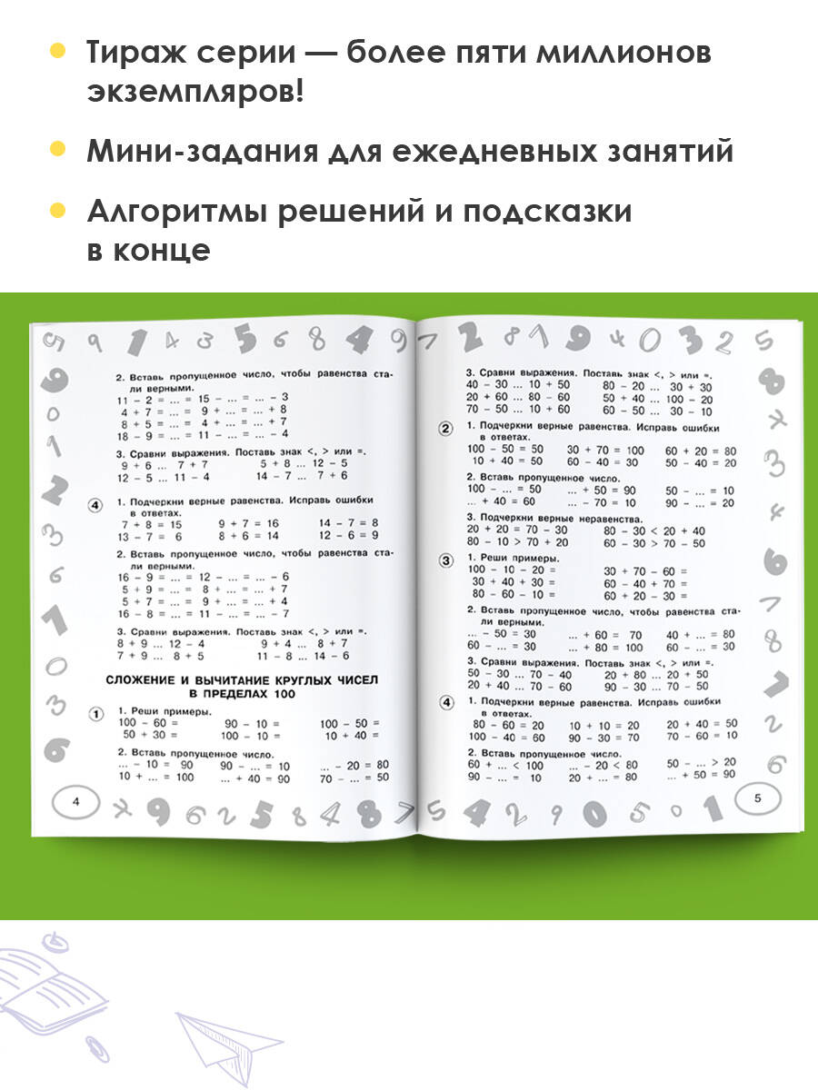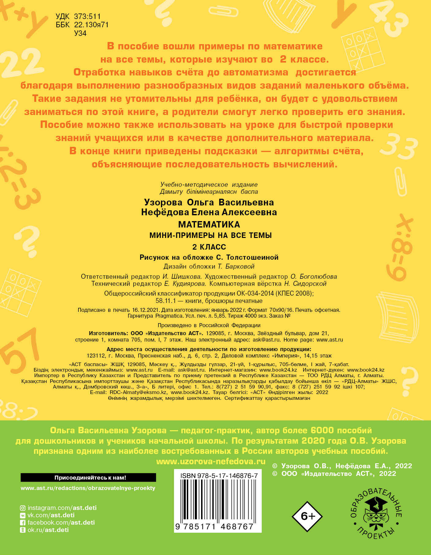 В пособие вошли примеры по математике на все темы, которые изучают во 2 классе. Отработка навыков счёта до автоматизма достигается благодаря выполнению разнообразных видов заданий. В конце книги приведены подсказки - алгоритмы счёта, объясняющие последовательность вычислений. Маленький объем заданий не утомителен для ребёнка, и он будет с удовольствием заниматься по этой книге, а родители смогут легко проверить его знания. Такие задания также удобно использовать на уроке для мини-контрольной или в качестве дополнительного материала. Книга пригодится на уроках математики, для работы дома с родителями и станет незаменимым помощником для репетиторов.| Издательство | ИЗДАТЕЛЬСТВО "АСТ" |
