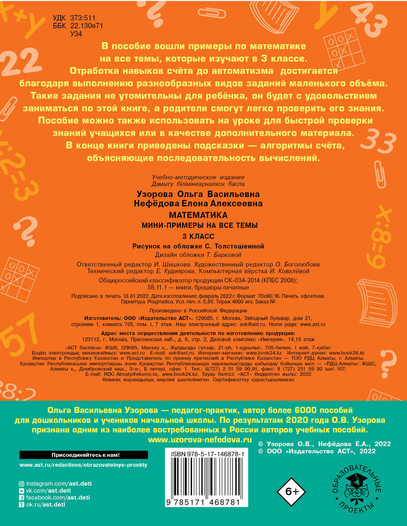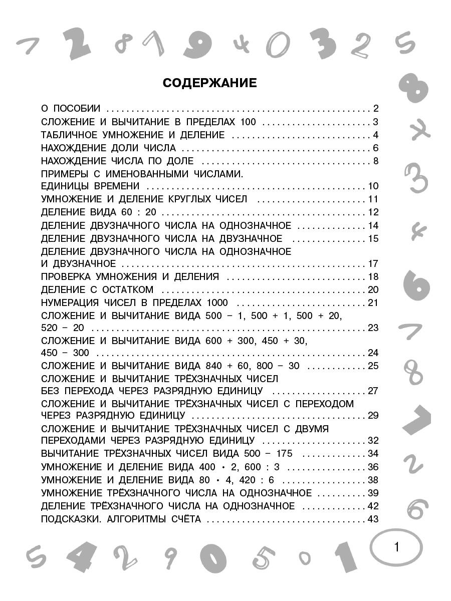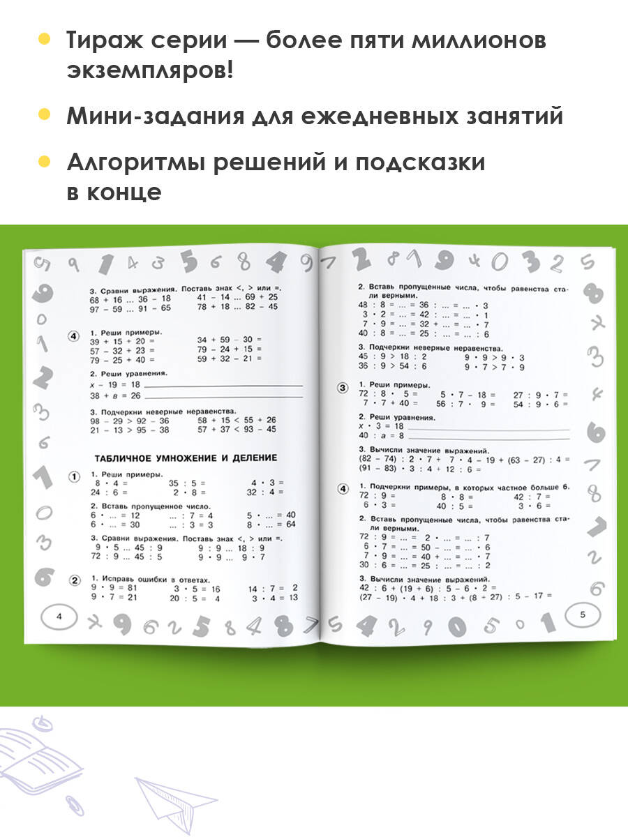 В пособие вошли примеры по математике на все темы, которые изучают в 3 классе. Отработка навыков счёта до автоматизма достигается благодаря выполнению разнообразных видов заданий. В конце книги приведены подсказки - алгоритмы счёта, объясняющие последовательность вычислений. Маленький объем заданий не утомителен для ребёнка, и он будет с удовольствием заниматься по этой книге, а родители смогут легко проверить его знания. Такие задания также удобно использовать на уроке для мини-контрольной или в качестве дополнительного материала. Книга пригодится на уроках математики, для работы дома с родителями и станет незаменимым помощником для репетиторов.