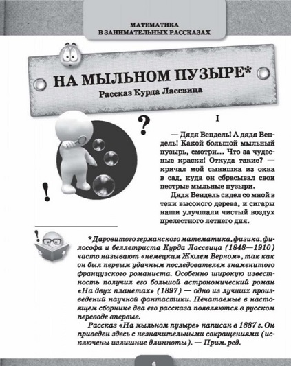 В книге раскрываются математические загадки, зашифрованные в приключенческих и фантастических рассказах Герберта Уэллса, Жюля Верна, Курда Лассвица и других. Возможно ли путешествие на мыльном пузыре? Существует ли механизм для движения в четвёртом измерении? Ответы на эти и другие интересные вопросы любознательный читатель найдёт здесь.