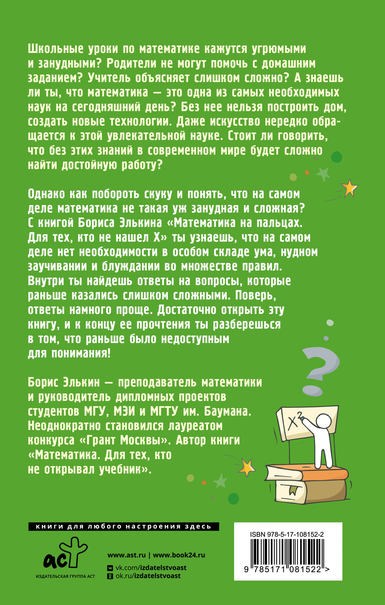 Школьные уроки по математике кажутся угрюмыми и занудными? Родители не могут помочь с домашним заданием? Учитель объясняет слишком сложно? А знаешь ли ты, что математика - это одна из самых необходимых наук на сегодняшний день? Без нее нельзя построить дом, создать новые технологии. Даже искусство нередко обращается к этой увлекательной науке. Стоит ли говорить, что без этих знаний в современном мире будет сложно найти достойную работу? Однако, как побороть скуку и понять, что на самом деле математика не такая уж занудная и сложная? С книгой Бориса Элькина "Математика на пальцах. Для тех, кто не нашел Х" ты узнаешь, что на самом деле нет необходимости в особом складе ума, нудном заучивании и блуждании во множестве правил. Внутри ты найдешь ответы на вопросы, которые раньше казались слишком сложными. Поверь, ответы намного проще. Достаточно открыть эту книгу, и к концу ее прочтения ты разберешься в том, что раньше было недоступным для понимания! Борис Элькин - преподаватель математики и руководитель дипломных проектов студентов МГУ, МЭИ и МГТУ им. Баумана. Неоднократно становился лауреатом конкурса "Грант Москвы". Автор книги "Математика. Для тех, кто не открывал учебник".| Издательство | ИЗДАТЕЛЬСТВО "АСТ" |