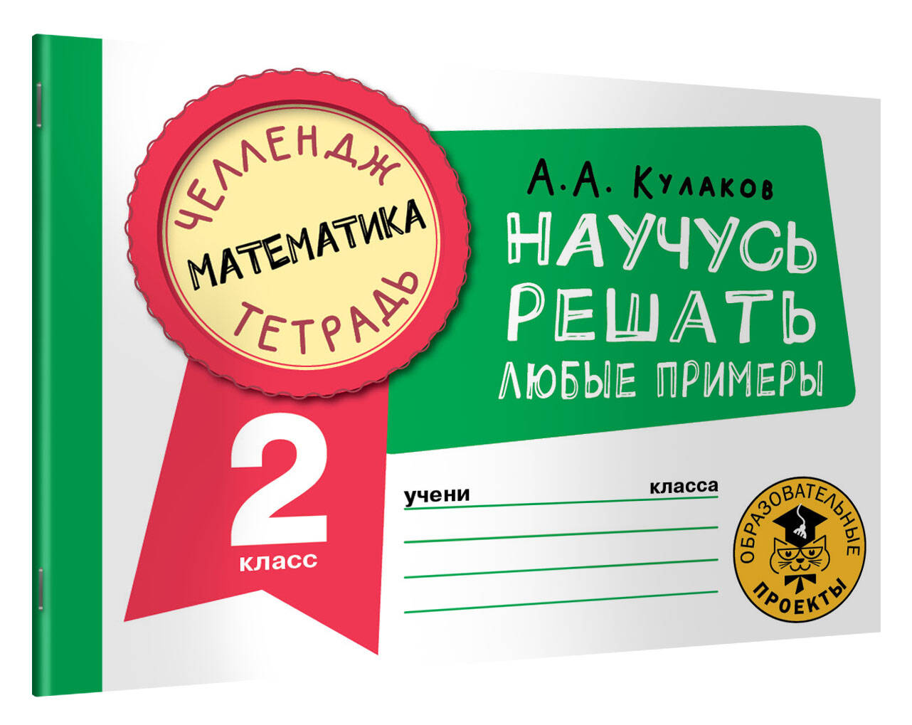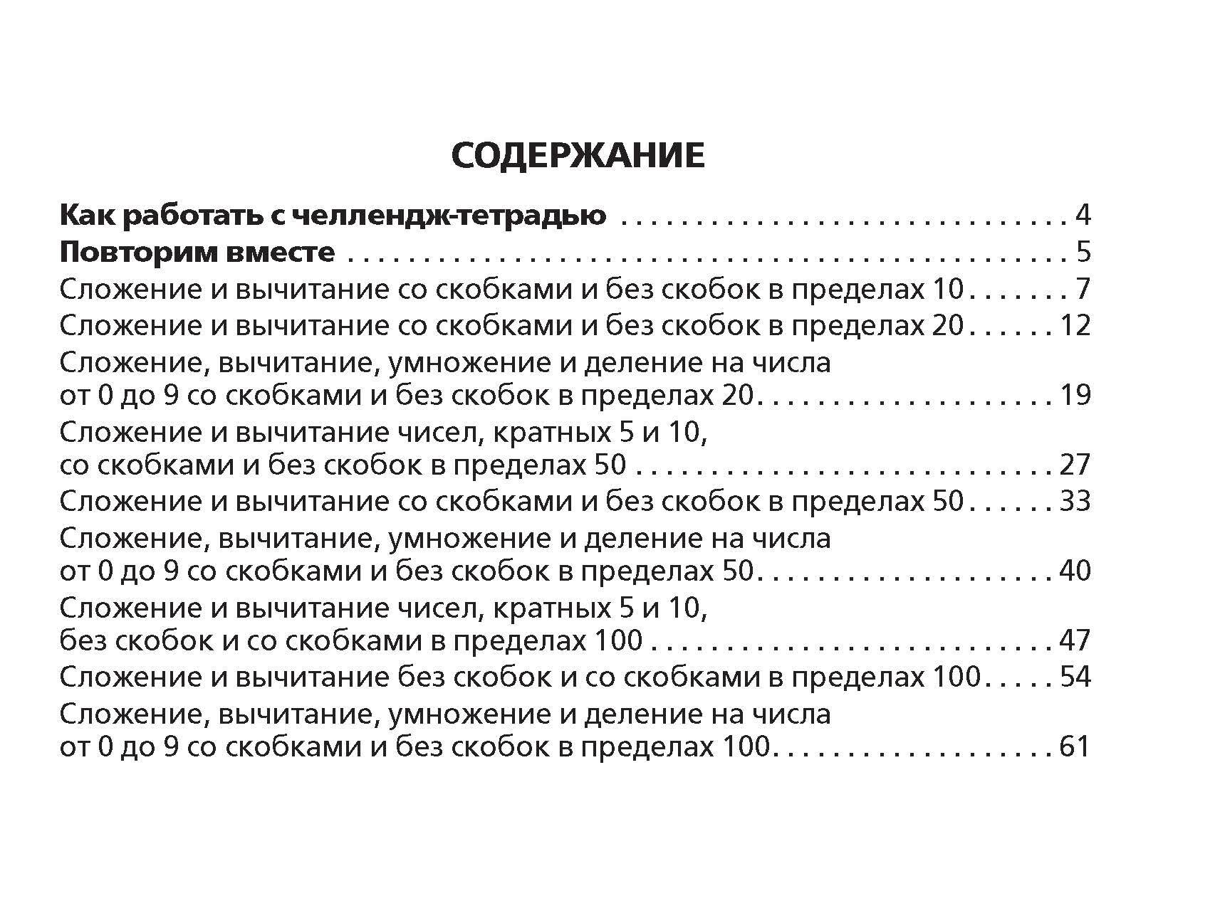 Челлендж (проблема, сложная задача, вызов) - это отличная возможность ставить перед собой цель и идти к её выполнению. Это - возможность чётко планировать свои действия на определённый срок: день, неделя, месяц, учебная четверть, полугодие и пр. Это своего рода соревнование: кто быстрее, качественнее. Задания в челлендж-тетради небольшие: 10-15 примеров на 1 занятие. Каждое занятие проверяет и оценивает сначала сам ребёнок (смайлики), затем взрослый: учитель, педагог или родитель. Как только ребёнок привыкает к такому виду работы (3-5 занятие), предлагаем усложнить задачу - проставить время выполнения заданий. Время пошло. Уместно также устроить соревнование на скорость выполнения заданий в классе. Соревновательный характер выполнения заданий и челленджей делает учебный процесс увлекательным и интересным, учит ребёнка ставить перед собой выполнимые цели и самостоятельно решать их. Челлендж-тетради приучат младшего школьника к самообучению, самопроверке и самооценке. Можно использовать челлендж-тетради на каждом уроке для проведения самостоятельных работ, дома для закрепления изученного материала на уроке, во время каникул, для быстрого повторения той или иной темы учебного курса. В тетрадь вошли темы: - правила порядка выполнения арифметических действий (выполнения действий со скобками и без скобок) - сложение и вычитание со скобками и без скобок в пределах 10 и 20; - сложение, вычитание, умножение и деление со скобками и без скобок в пределах 20 - сложение и вычитание чисел, кратных 5 и10, со скобками и без скобок в пределах 50.| Издательство | ИЗДАТЕЛЬСТВО "АСТ" |