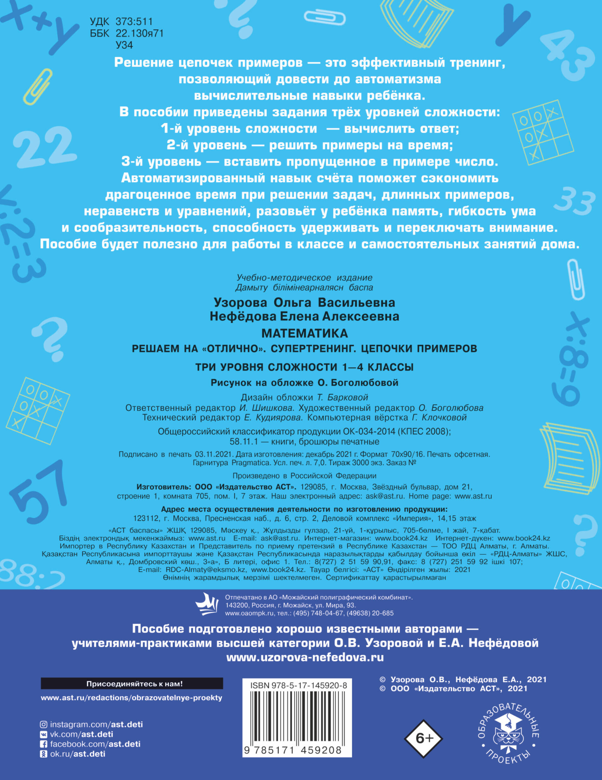 Аннотация: Математика. Решаем на "отлично". Супертренинг. Цепочки примеров. Три уровня сложности. 1-4 классы