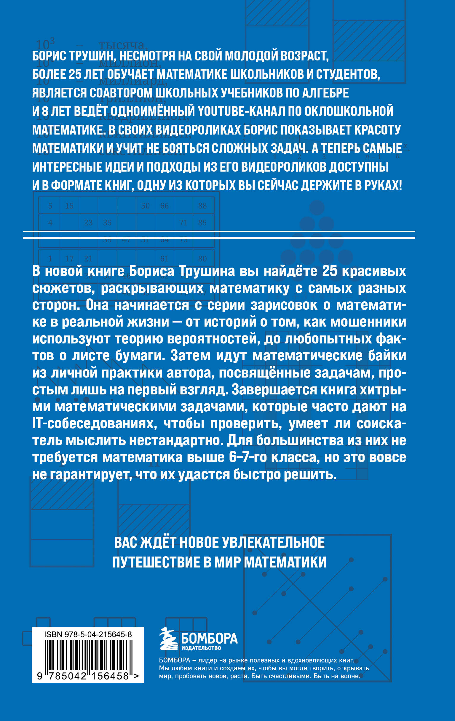От автора: «Эта книга будет интересна как школьникам, увлечённым математикой, так и взрослым, которые хотят, наконец, её полюбить. В ней вы найдёте 25 красивых сюжетов, которые раскроют для вас математику с самых разных сторон. Всё начнётся с серии зарисовок о математике в реальной жизни - от историй про то, как мошенники используют теорию вероятности, до интересных фактов о листе бумаги. Далее идёт несколько математических баек из моей практики, посвящённых задачам, которые на первый взгляд кажутся простыми, но таковыми не являются, а также про простые детские задачки, которые маститые профессора воспринимают как крайне сложные. Завершается книга хитрыми математическими задачами, которые часто дают на собеседованиях в IT-компаниях, чтобы проверить, умеет ли соискатель мыслить нестандартно. Для большинства из них не требуется математика выше 6-7 класса, однако это вовсе не гарантирует, что их удастся быстро решить». Из книги: «Вы идёте по лесу, и случайно съели ядовитый гриб. Вы знаете, что противоядием являются синие лягушки. Чтобы выжить, нужно лизнуть одну из этих лягушек, но только самки обладают лечебным свойством. Если вы лизнёте самца, ничего не произойдёт. При этом самки и самцы внешне ничем не отличаются, но самцы издают странный и заметный квак. Вот вы стоите и слышите за спиной этот странный "квак". Поворачиваетесь и видите рядом две синие лягушки. Вы берёте и лижете обеих лягушек. Какова вероятность, что вы выживете? Или, другими словами, какова вероятность, что хотя бы одна из этих лягушек окажется самкой?»| Издательство | ООО "Издательство "Эксмо" |