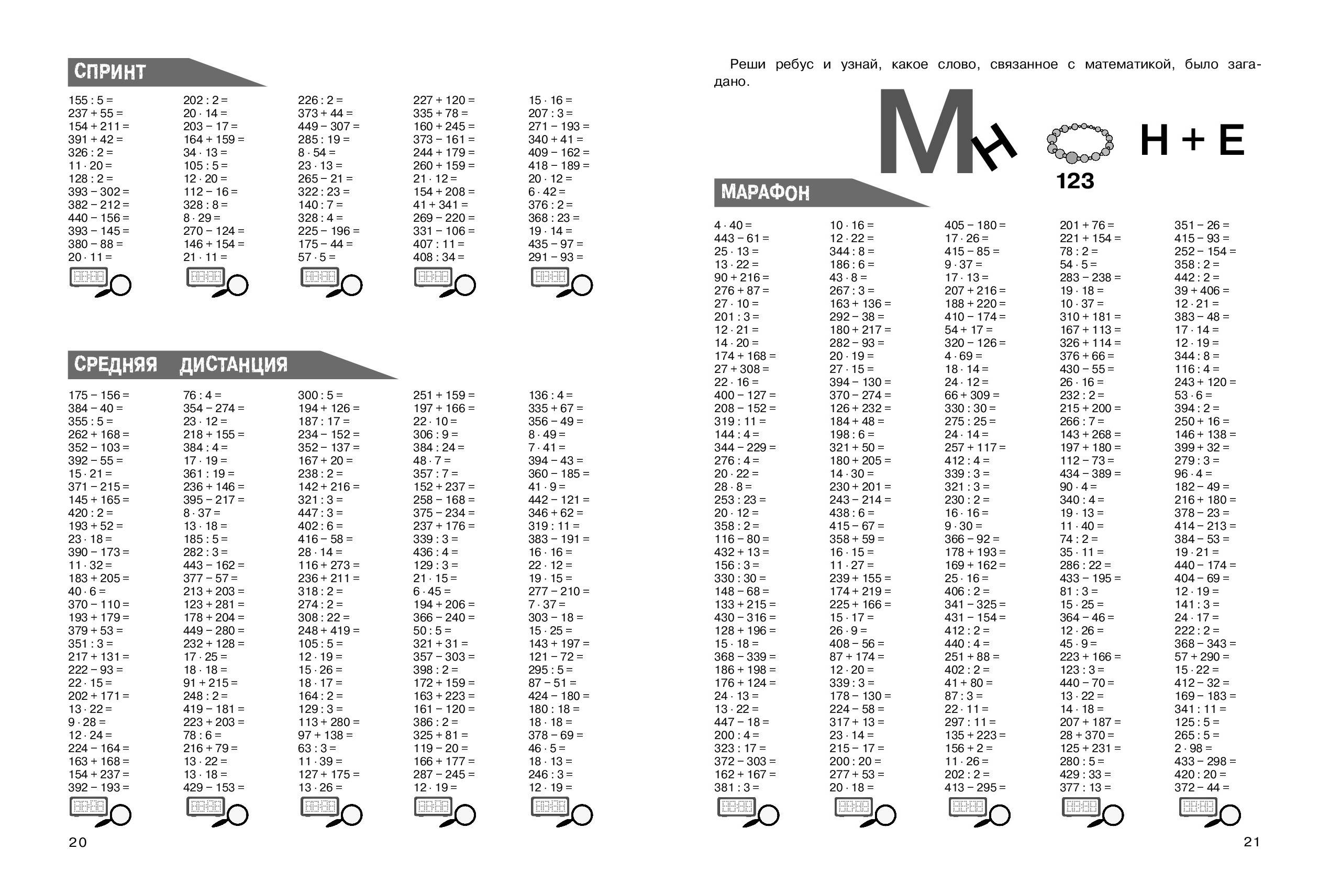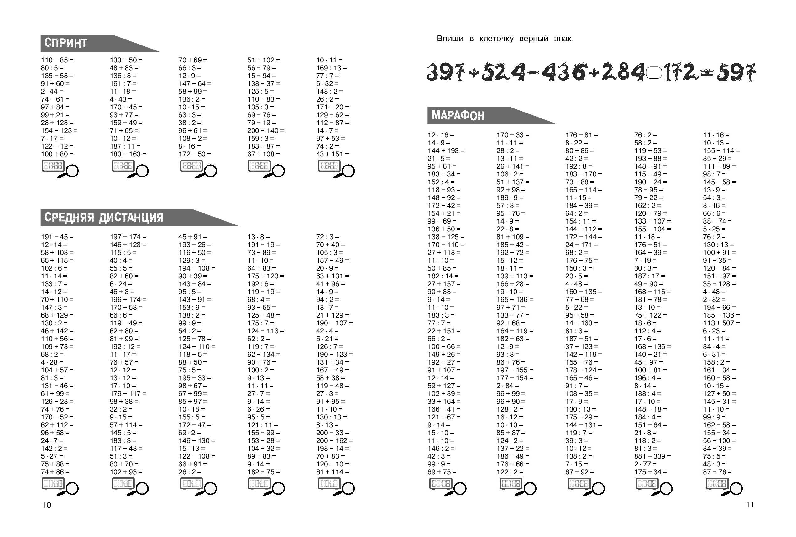 Научиться мгновенно считать в уме, не делая при этом ошибок, может любой школьник. Для этого нужно систематически и в большом объёме выполнять задания на каждое математическое действие. В этом тренажёре ученику предлагается решить 30 000 примеров по всем темам программы по математике за курс 4 класса. Выполнив такое количество примеров, школьник надёжно закрепит полученные знания и доведёт навык устного счёта до полного автоматизма. Благодаря регулярной работе с тренажёром четвероклассник сможет оценить уровень своих знаний и заметно его повысить.| Издательство | ООО "Издательство "Эксмо" |