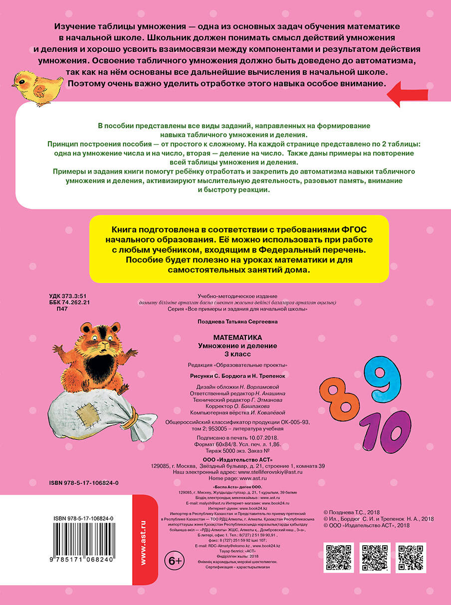 Изучение таблицы умножения - одна из основных задач обучения математике в начальной школе. Школьник должен понимать смысл действий умножения и деления и хорошо усвоить взаимосвязи между компонентами и результатом действия умножения. Освоение табличного умножения должно быть доведено до автоматизма, так как на нём основаны все дальнейшие вычисления в начальной школе. Поэтому очень важно уделить отработке этого навыка особое внимание. В пособии представлены все виды заданий, направленных на формирование навыка табличного умножения и деления. Принцип построения пособия - от простого к сложному. На каждой странице представлено по две работы - одна на умножение числа и на число, вторая - деление на число. Также даны примеры на повторение всей таблицы умножения и деление. Для достижения хороших результатов рекомендуем выполнять две работы в день. Примеры и задания книги помогут ребёнку отработать и закрепить до автоматизма навыки табличного умножения и деления, активизируют мыслительную деятельность, разовьют память, внимание и быстроту реакции. Книга подготовлена в соответствии с требованиями ФГОС начального образования. Её можно использовать при работе с любым учебником, входящим в Федеральный перечень. Пособие будет полезно на уроках математики и для самостоятельных занятий дома.