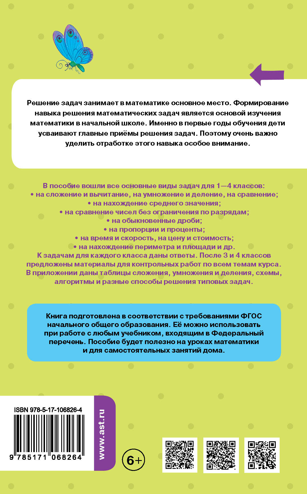 Решение задач занимает в математике основное место. Формирование навыка решения математических задач является одной из важных задач начальной школы. Именно в первые годы обучения дети усваивают главные приемы решения задач. Поэтому очень важно уделить отработке этого навыка особое внимание. В пособие вошли все основные виды задач для 1-4 классов: - на сложение и вычитание, на умножение и деление, на сравнение; - на нахождение среднего значения; - на сравнение чисел без ограничения по разрядам; - на обыкновенные дроби; - на пропорции и проценты; - на время и скорость, на цену и стоимость; - на нахождение периметра и площади и др. К задачам для каждого класса даны ответы. После 3 и 4 классов предложены материалы для контрольных работ по всем темам курса. В приложении даны таблицы сложения, умножения и деления, схемы, алгоритмы и разные способы решения типовых задач. Книга подготовлена в соответствии с требованиями ФГОС начального образования. Ее можно использовать при работе с любым учебником, входящим в Федеральный перечень. Пособие будет полезно на уроках математики и для самостоятельных занятий дома.| Издательство | ИЗДАТЕЛЬСТВО "АСТ" |