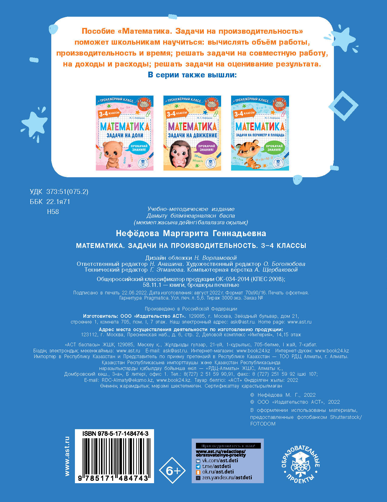 Пособие "Математика. Задачи на производительность" поможет учащимся 3-4 классов разобраться в решении наиболее сложных задач в начальной школе. Дети научатся: - вычислять объём работы, производительность и время; - решать задачи на совместную работу; - решать задачи на доходы и расходы; - решать задачи на оценивание результата. Пособие можно использовать в школе на уроках математики, а также дома для повторения и закрепления пройденного материала.| Издательство | АСТ |